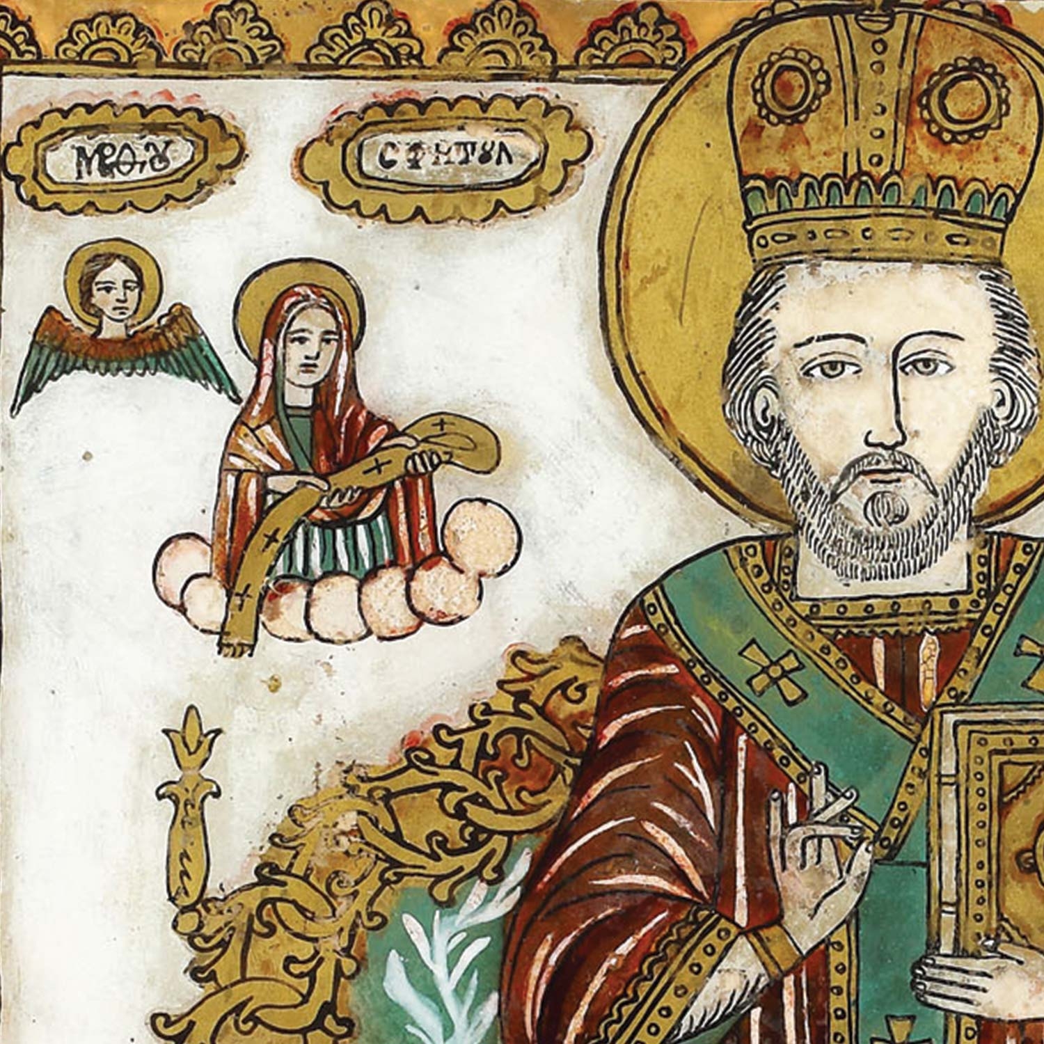 18. Icoană pe glajă, ”Sfântul Nicolae făcătorul de minuni, tronând”, atribuit zugrav Matei Țâmforea, Cârțișoara, sfârșitul sec. XIX