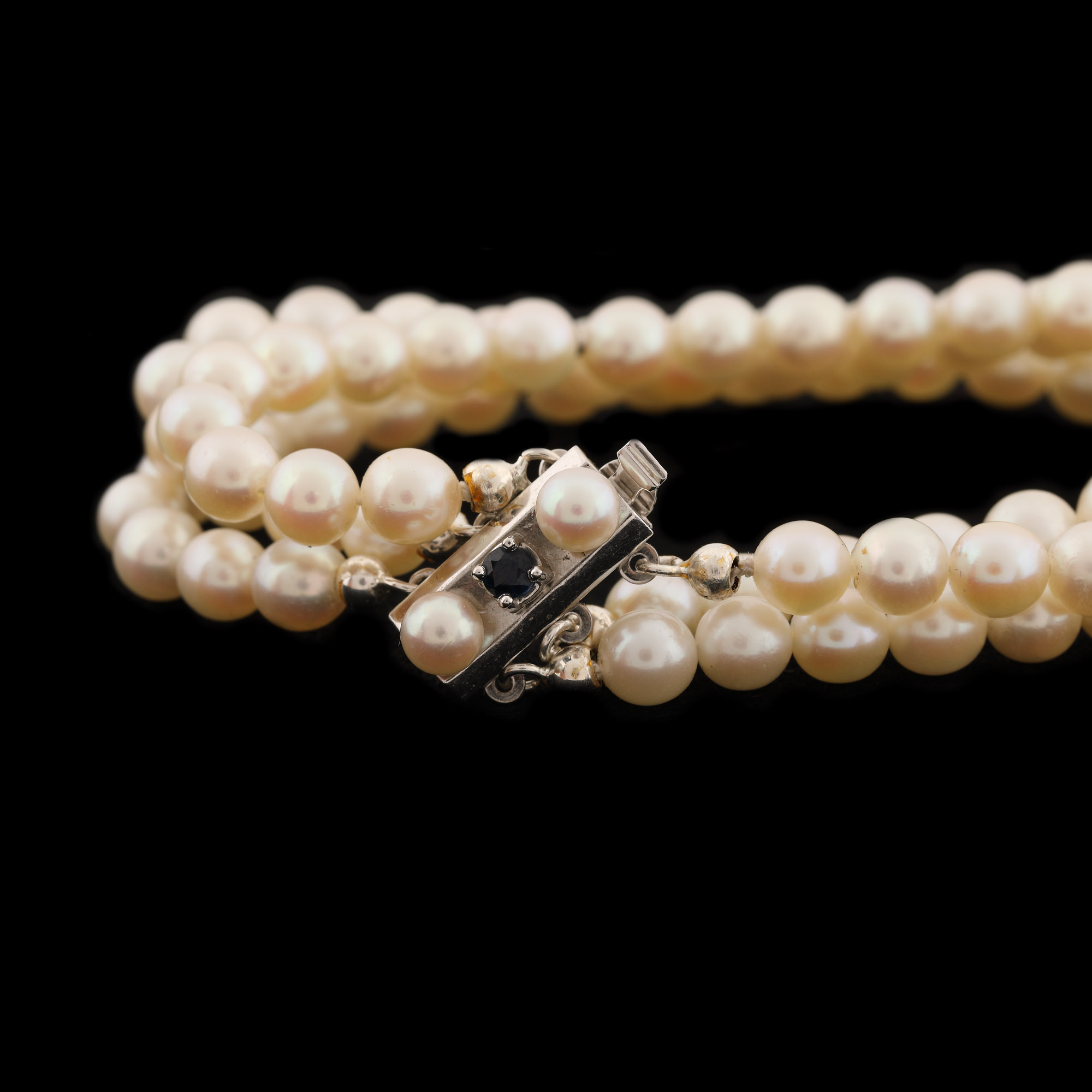 16. Brățară din perle, cu închizătoare din aur alb, decorată cu safir și perle
