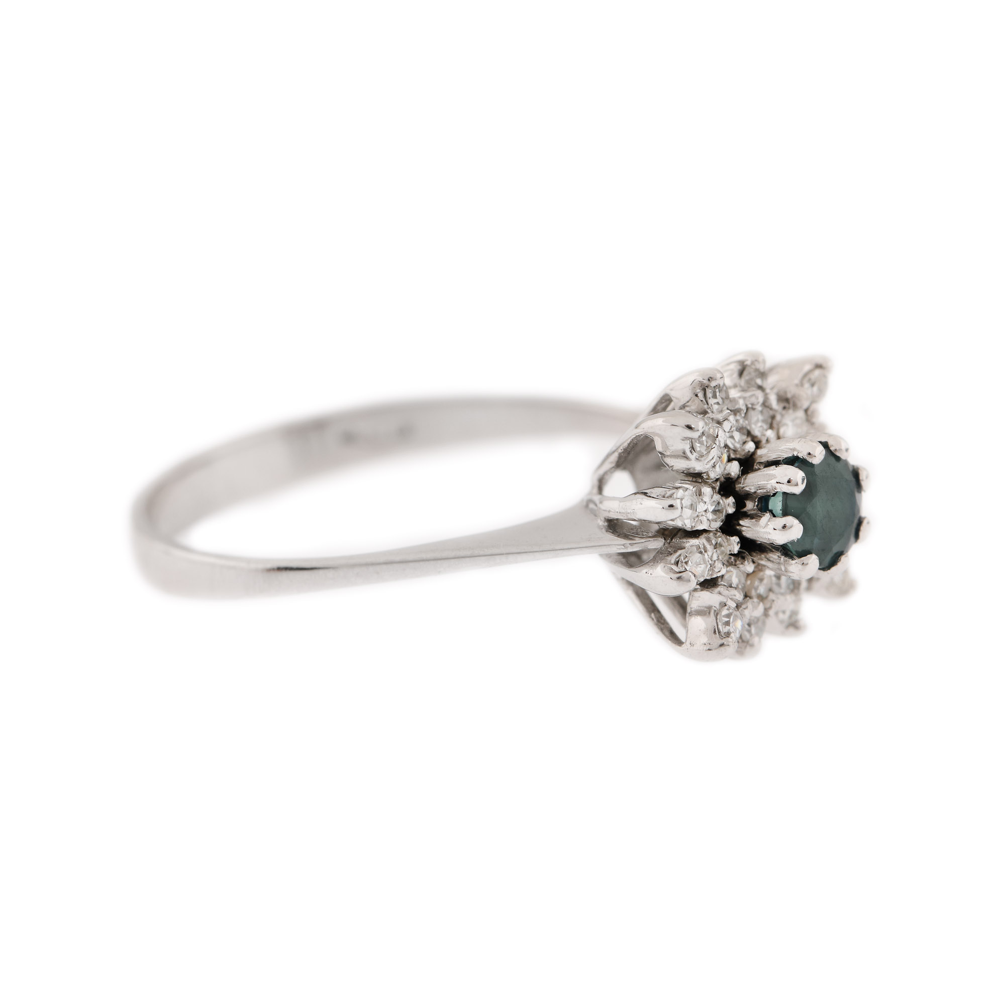 24 diamante single cut, culoare F-G, claritate VS, cca. 0,15 ct. și 1 safir rotund fațetat, culoare albastru, claritate eye-clean, cca. 0,25 ct.