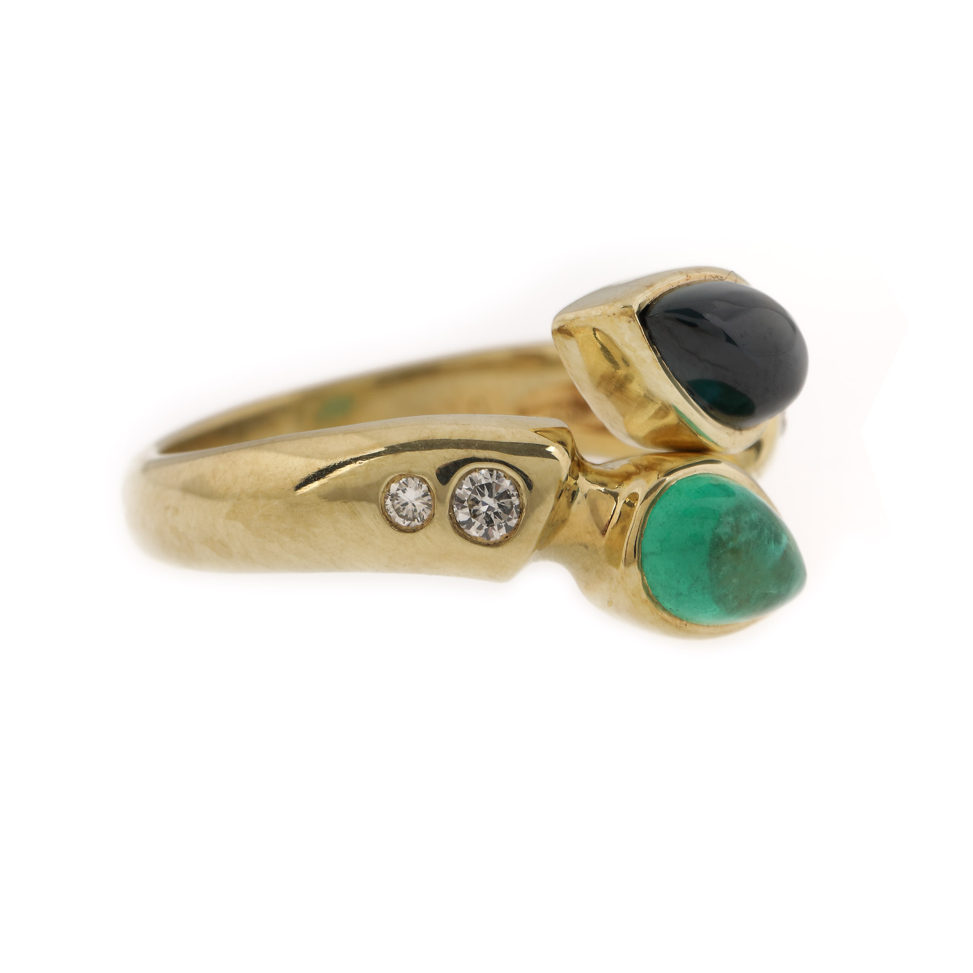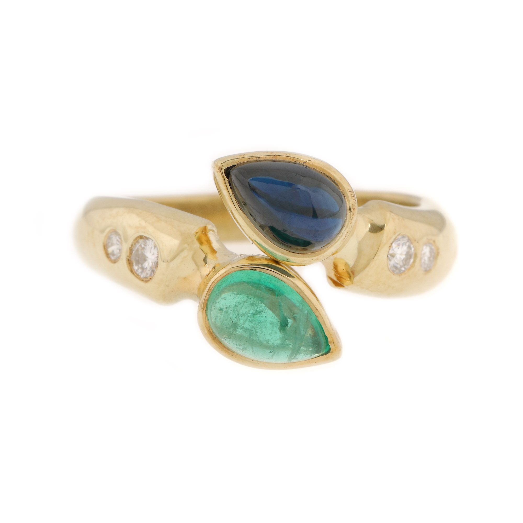 4 diamante rotunde briliant, culoare J-K, claritate VS, cc.a 0,12 ct.; 1 safir pară caboșon, culoare albastru, claritate SI, cca. 0,46 ct. și 1 smarald pară caboșon, culoare verde, claritate moderately included, cca. 0,38 ct.