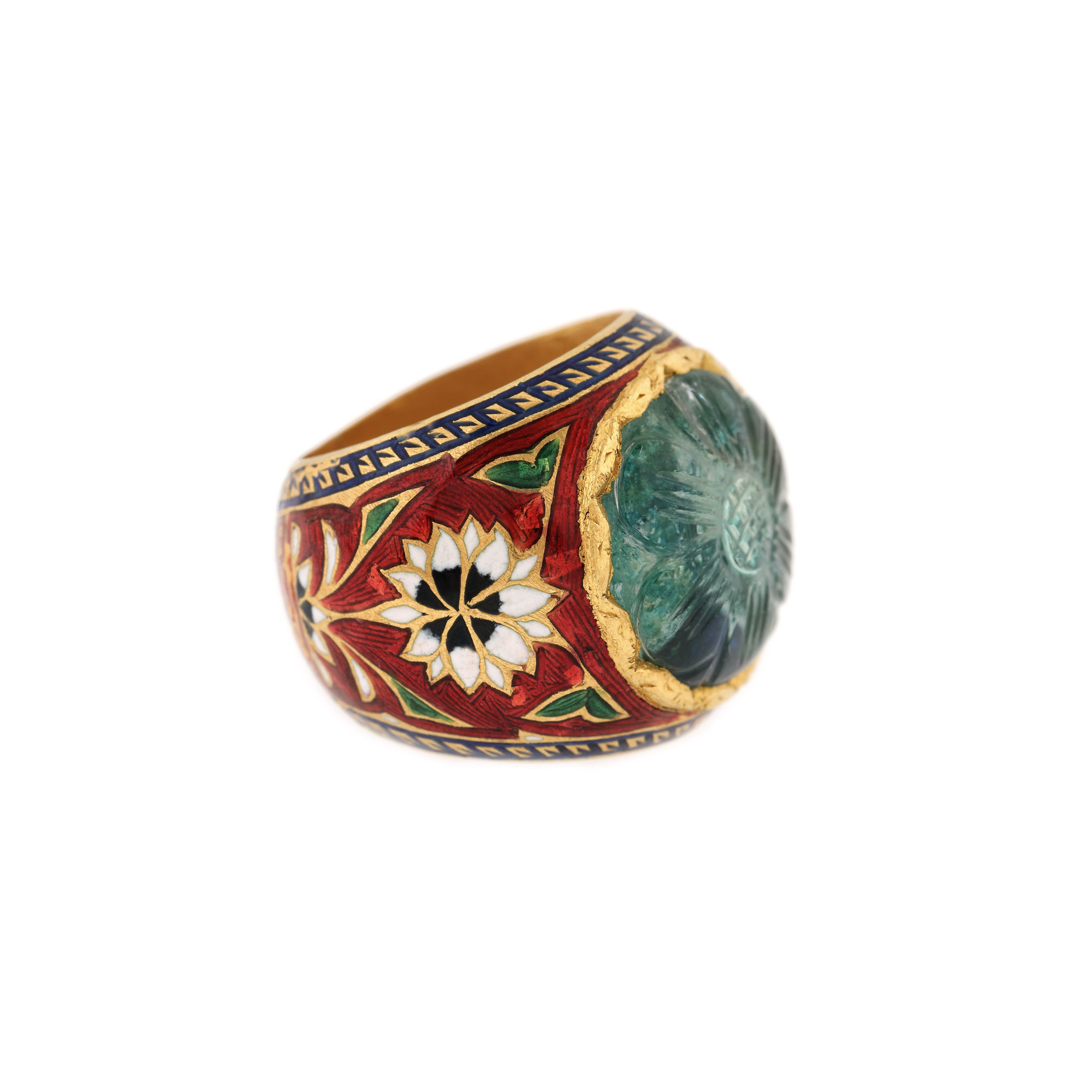 30. Inel din aur, ornat cu email și cuarț sculptat