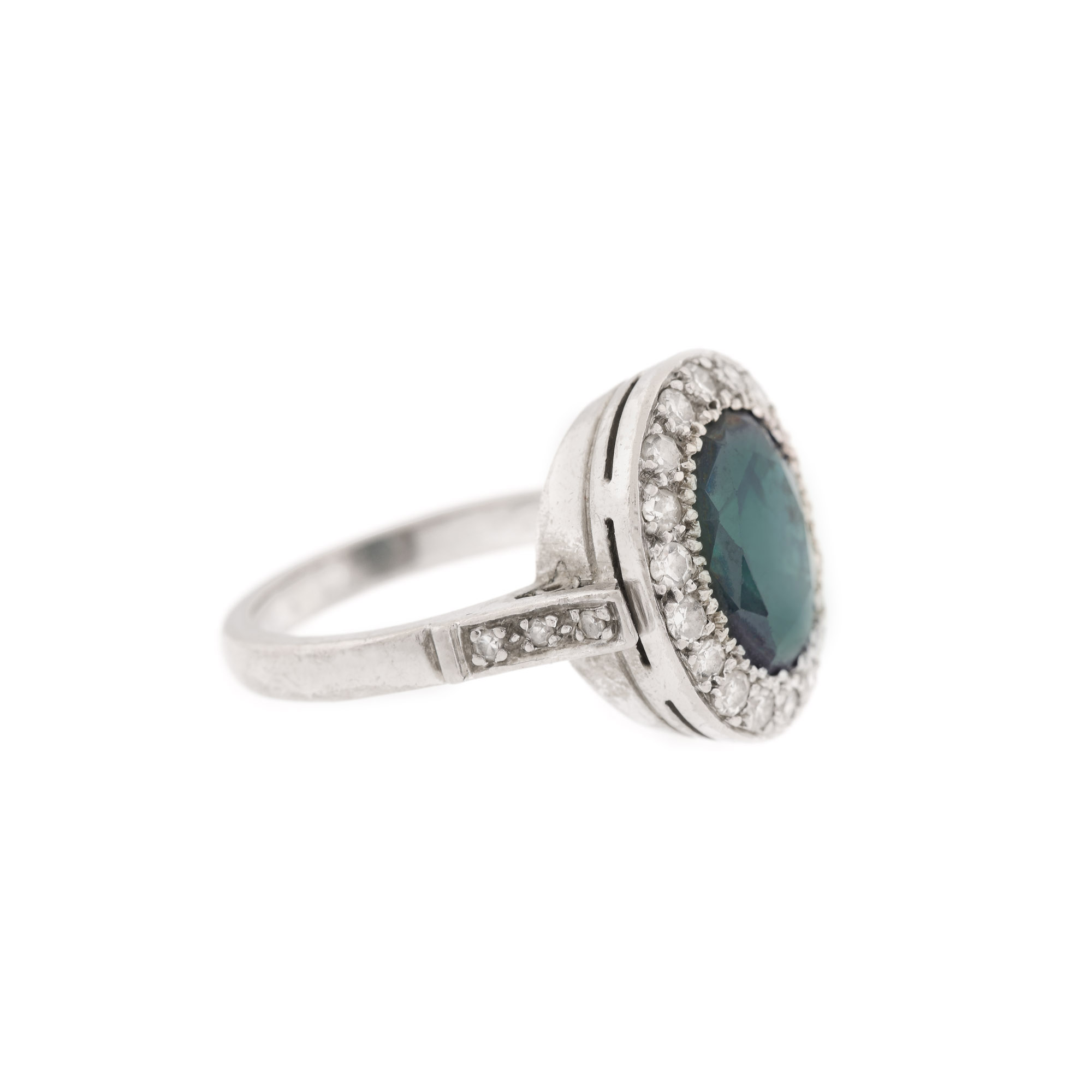 3 safire oval fațetate, culoare albastru-verzui, claritate SI, cca. 14,00 ct. și 64 diamante single cut, culoare G-H, claritate VS, cca. 1,20 ct.