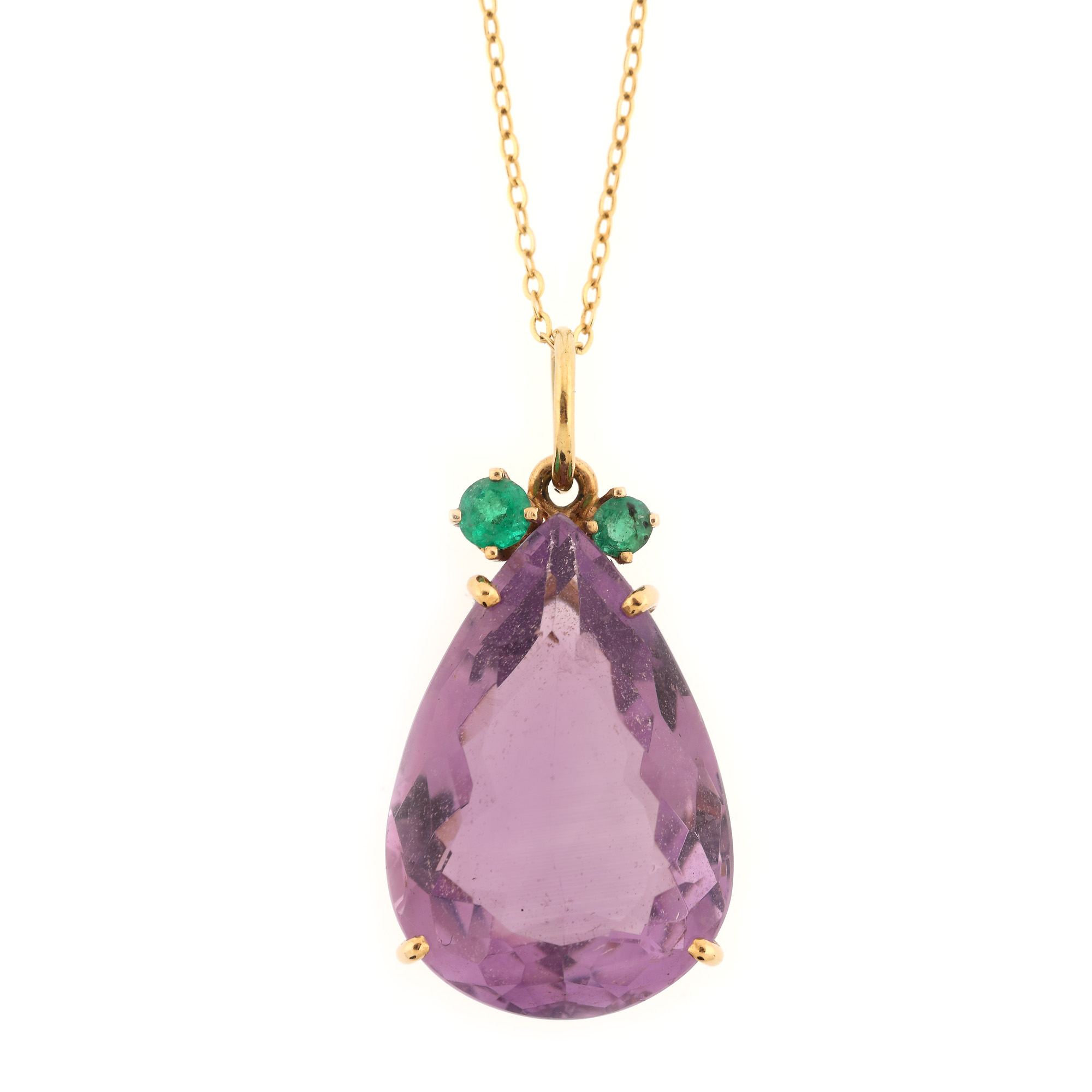 27. Lanț cu pandantiv din aur, decorat cu ametist și smaralde