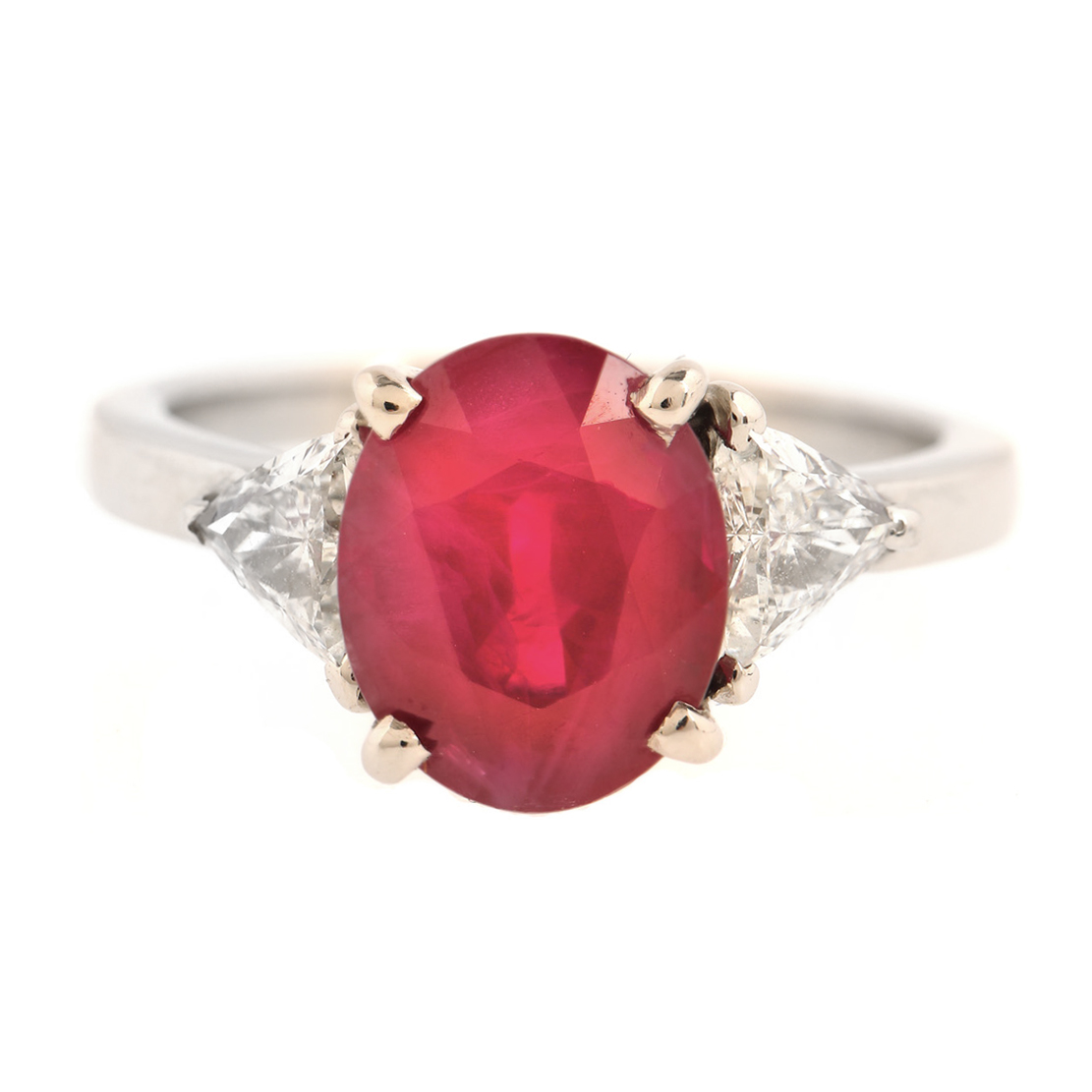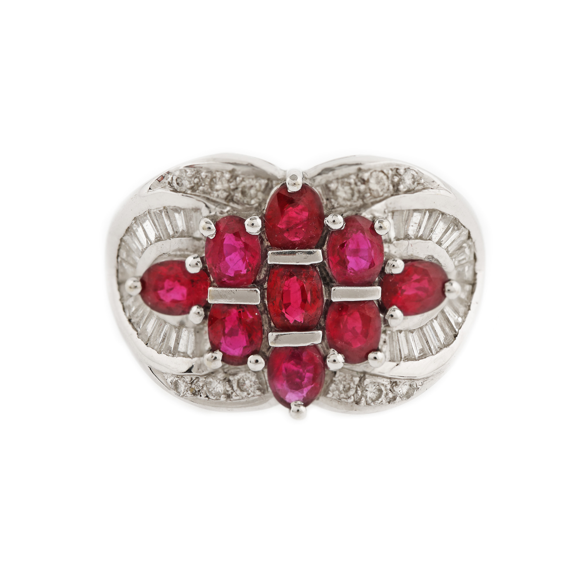 18. Inel din aur alb, decorat cu rubine anturate de diamante