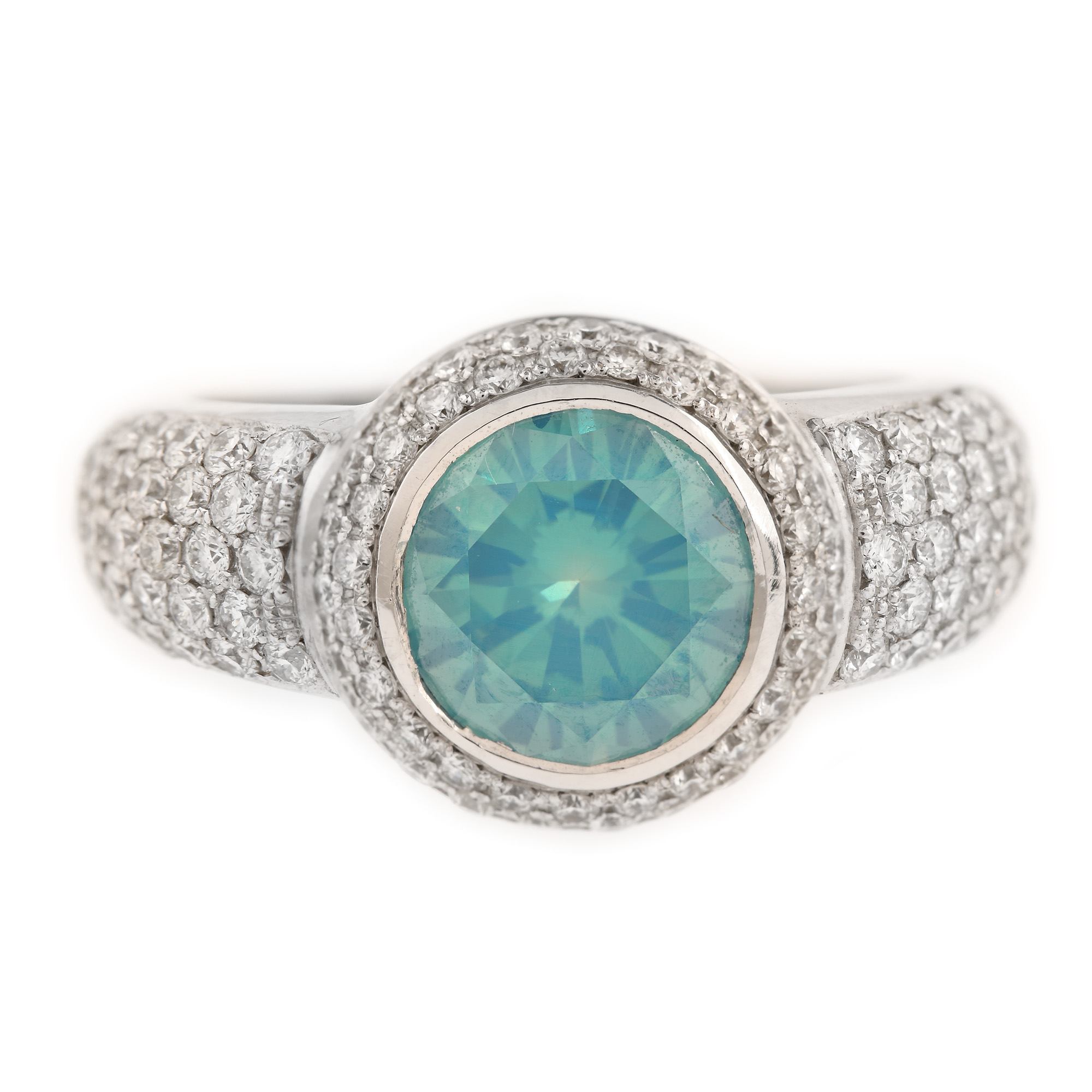 33. Inel din aur alb, decorat central cu diamant albastru anturat de briliante