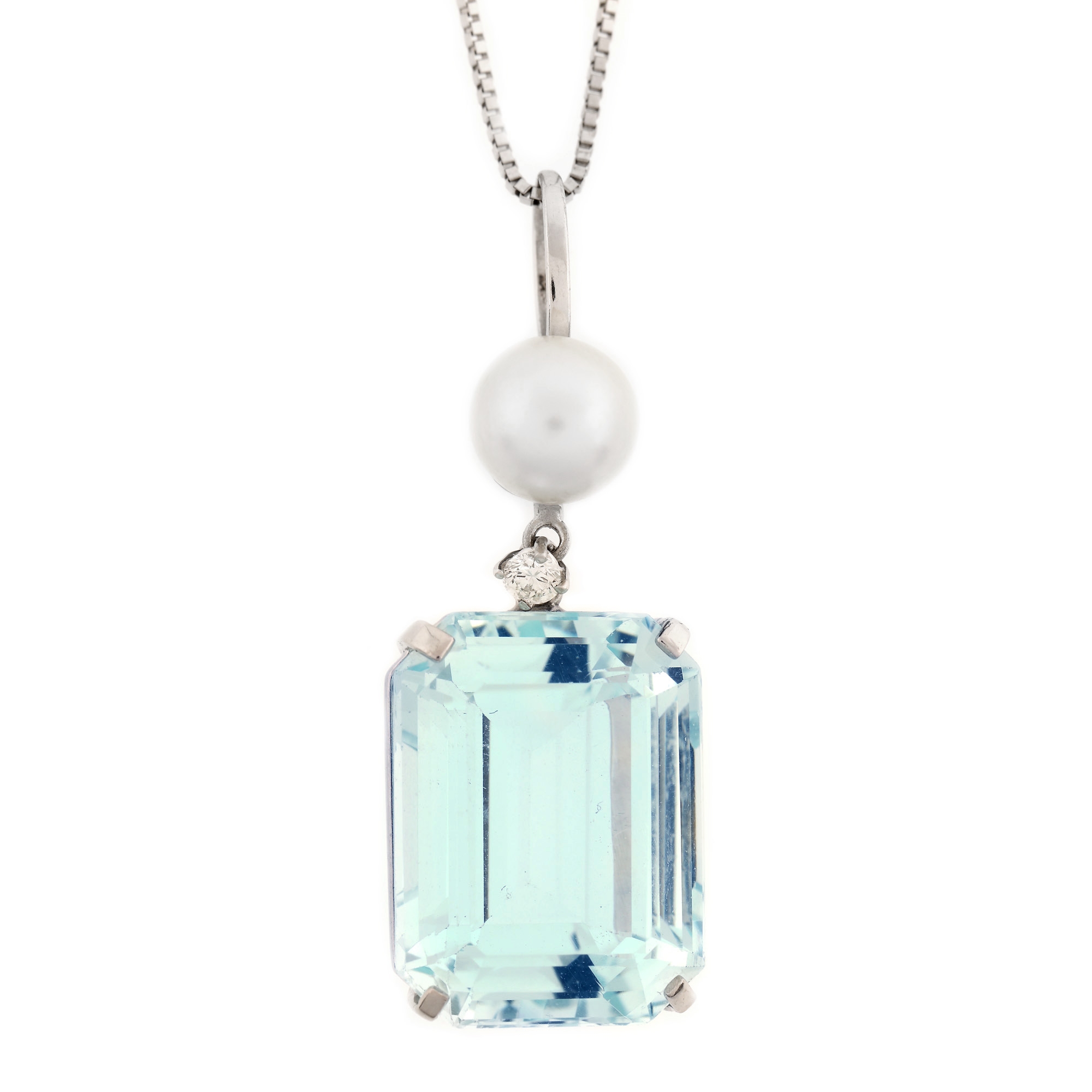 20. Lanț cu pandantiv din aur alb, decorat cu acvamarin, diamant și perlă