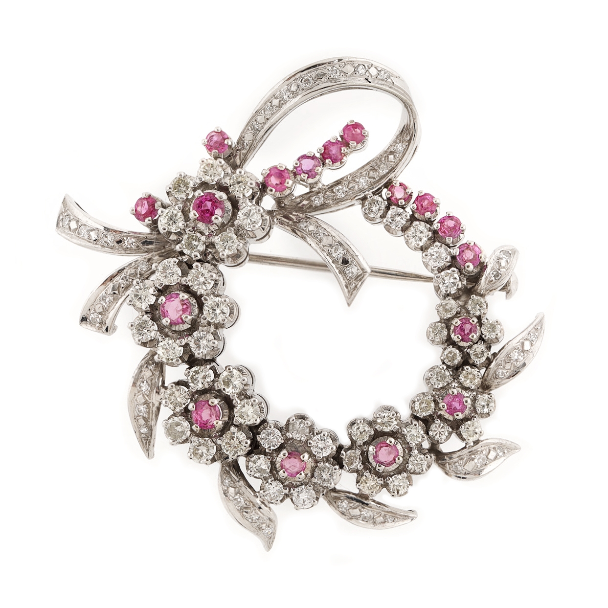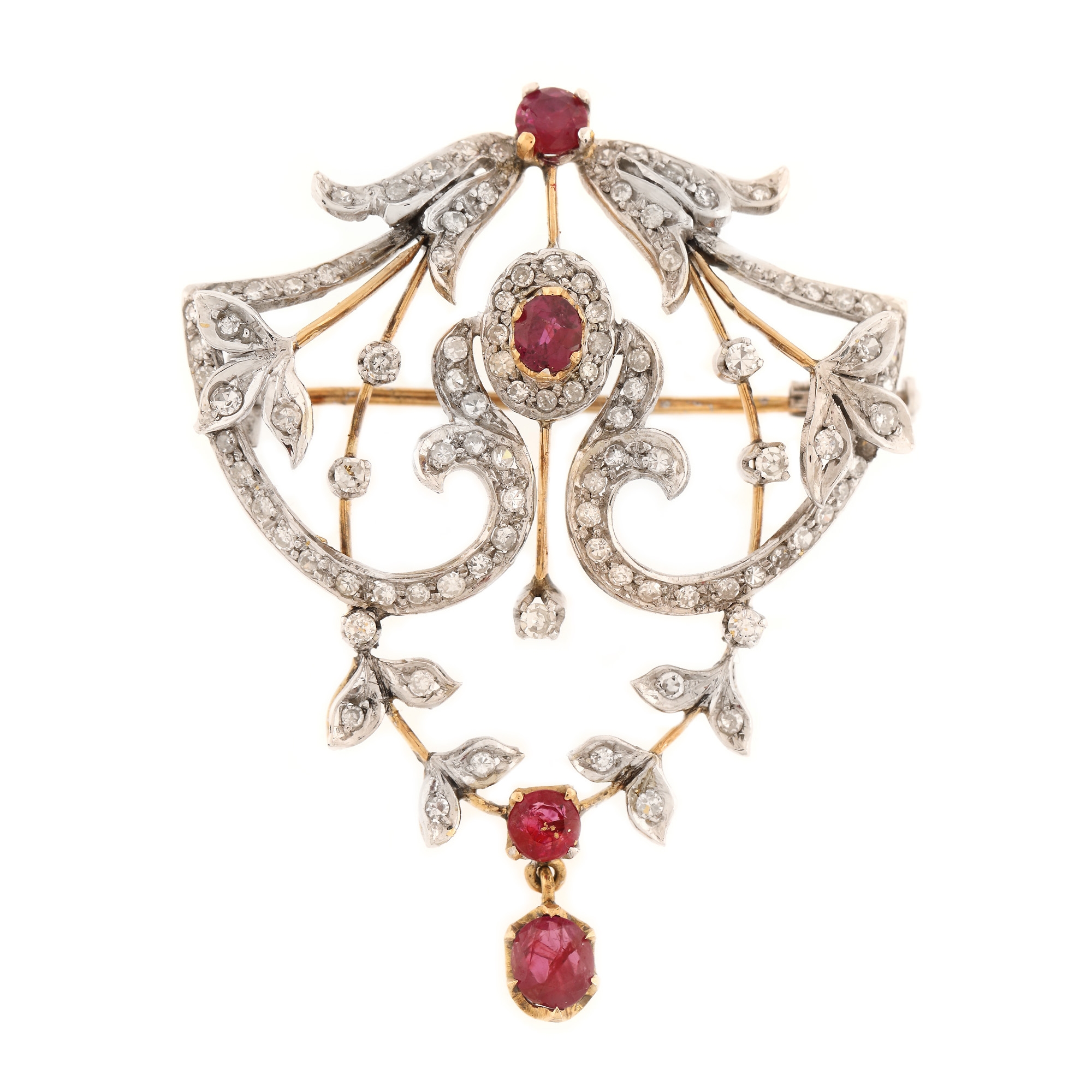 24. Broșă din aur bicolor, decorată cu rubine și diamante