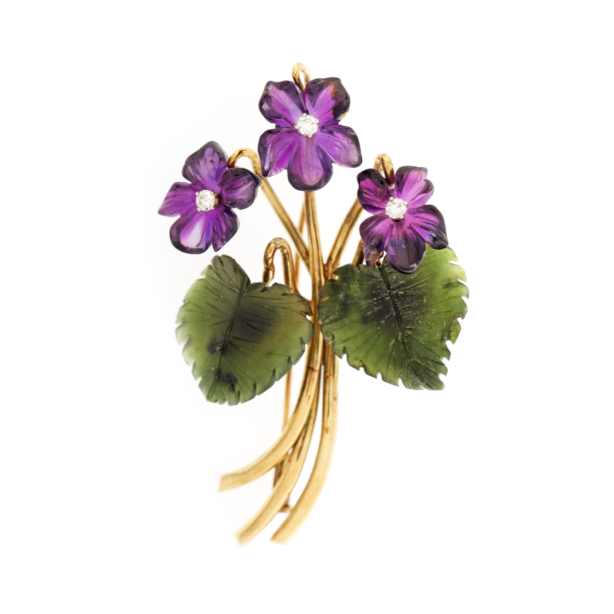 25. Broșă din aur, în forma unui buchet cu flori, decorată cu diamante, ametist și nefrit sculptat