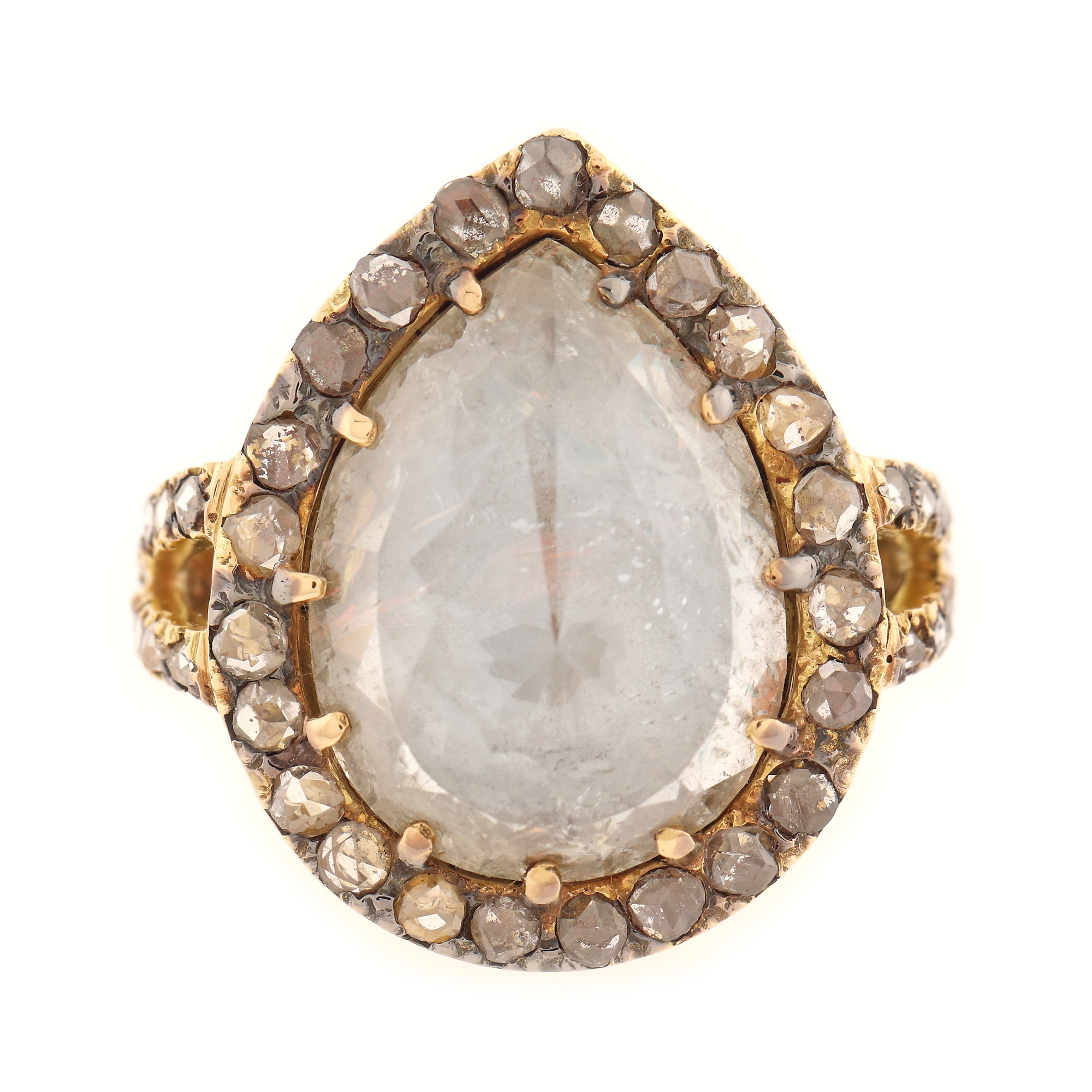 31. Inel din aur, decorat central cu rar diamant cca. 15,90 ct. anturat de diamante