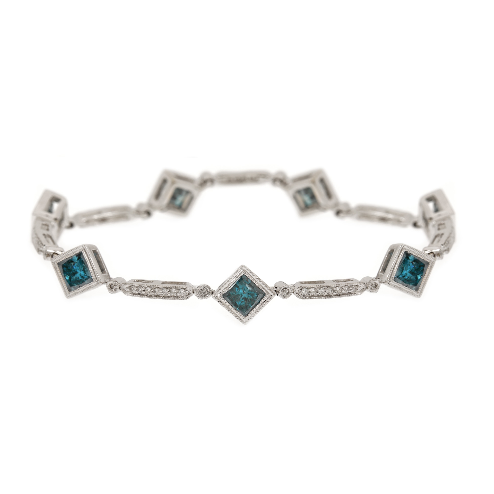 8 diamante princess cut, culoare albastru (culoare obținută în urma tratamentului), claritate I1-I2, cca. 3,92 ct. și 72 diamante rotunde briliant, culoare H-J, claritate VS2-I1, cca. 0,32 ct.