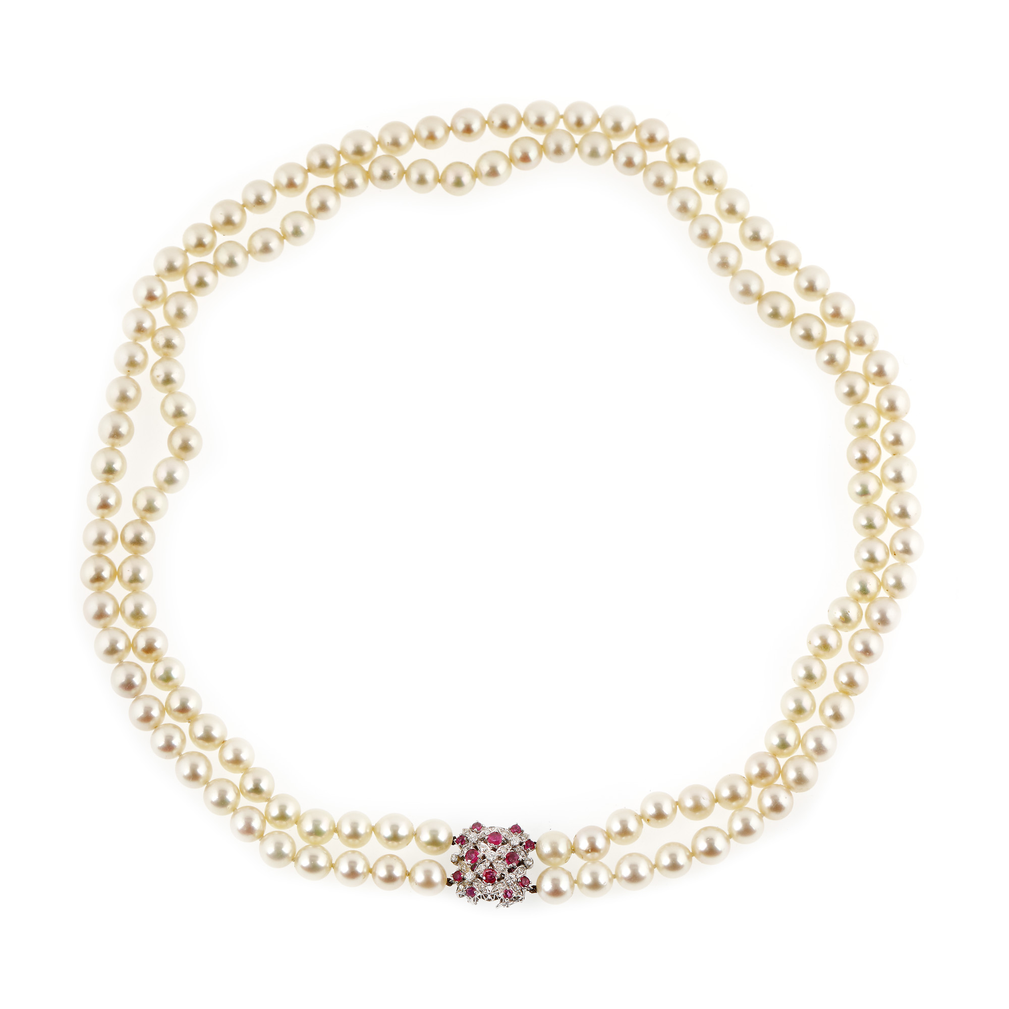17. Colier din perle, cu închizătoare din aur alb, ornată cu rubine și diamante [Cca. 1960]