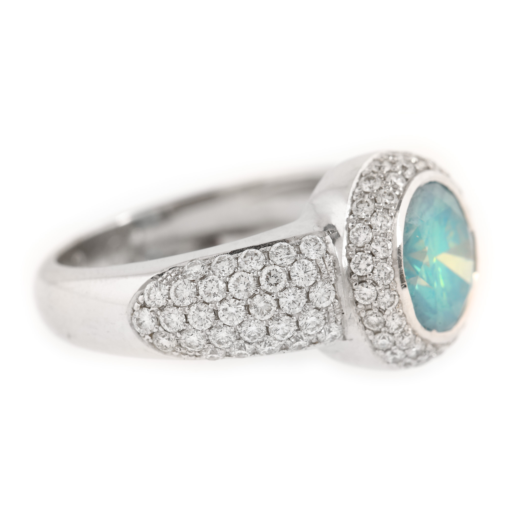 1 diamant rotund briliant, culoare bleu (obținută în urma tratamentului), claritate SI1, cca. 2,72 ct. și 104 diamante rotunde briliant, culoare F-G, claritate VVS1-VS1, cca. 1,00 ct.