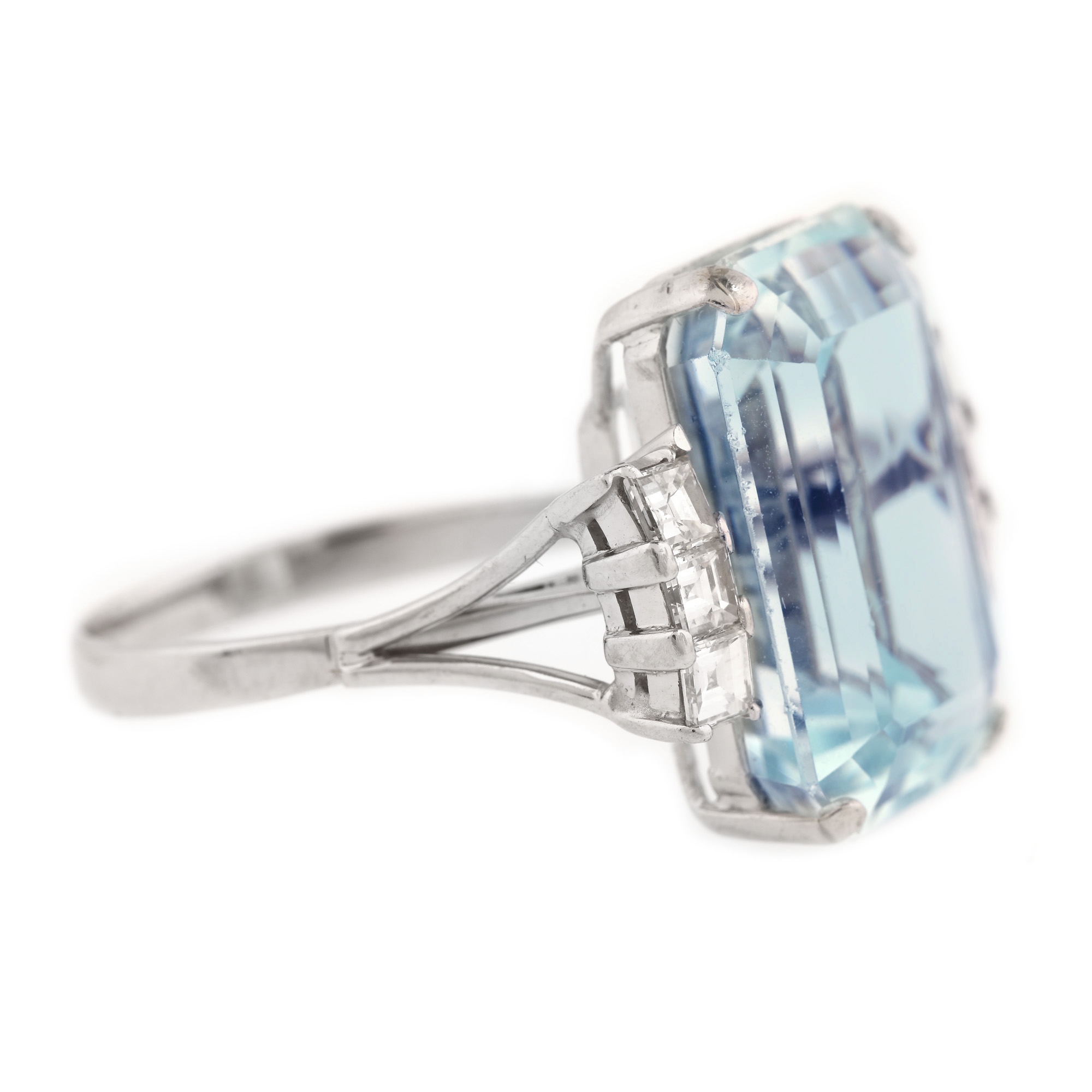 1 acvamarin emerald cut, culoare bleu, claritate eye-clean, cca. 19,40 ct. și 6 diamante step cut pătrate, culoare F-G, claritate VVS2-VS1, cca. 0,88 ct.