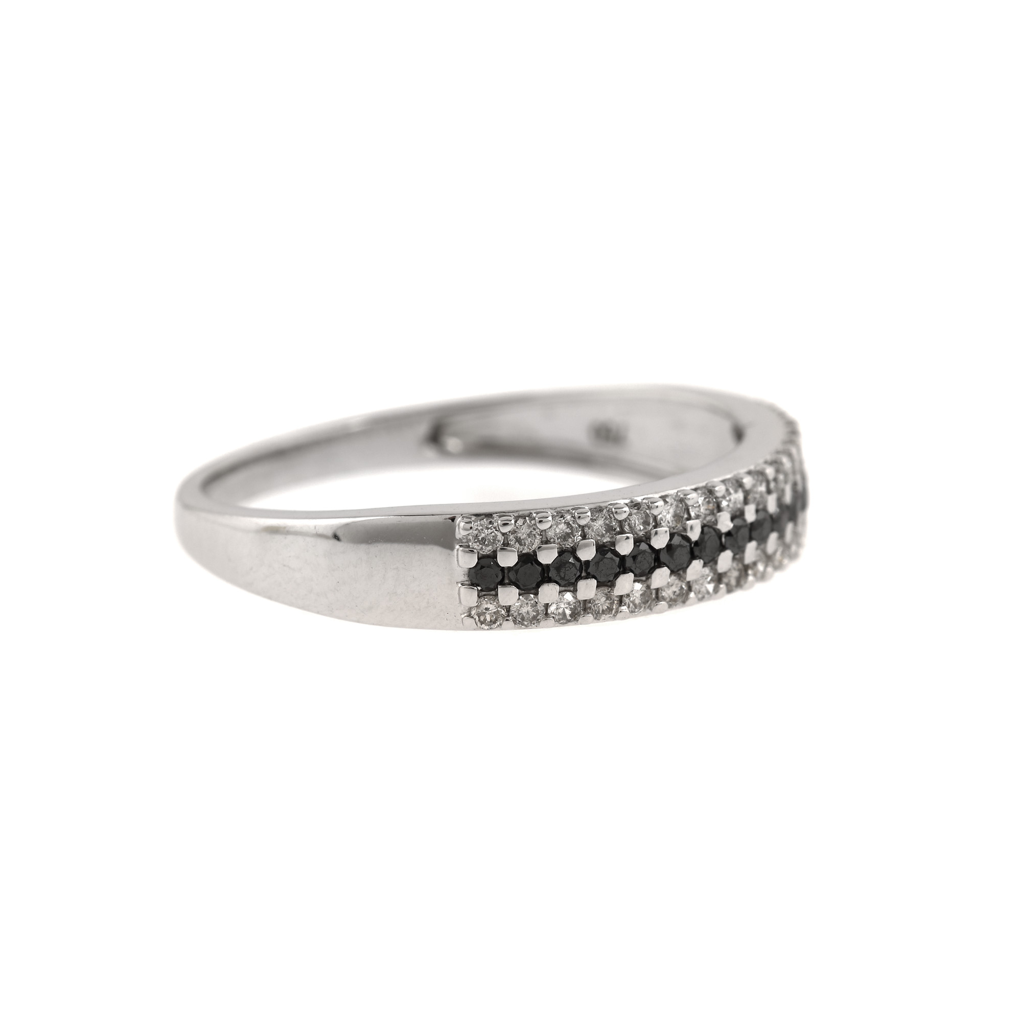 36. Inel din aur alb, decorat cu trei șiruri de diamante albe și negre