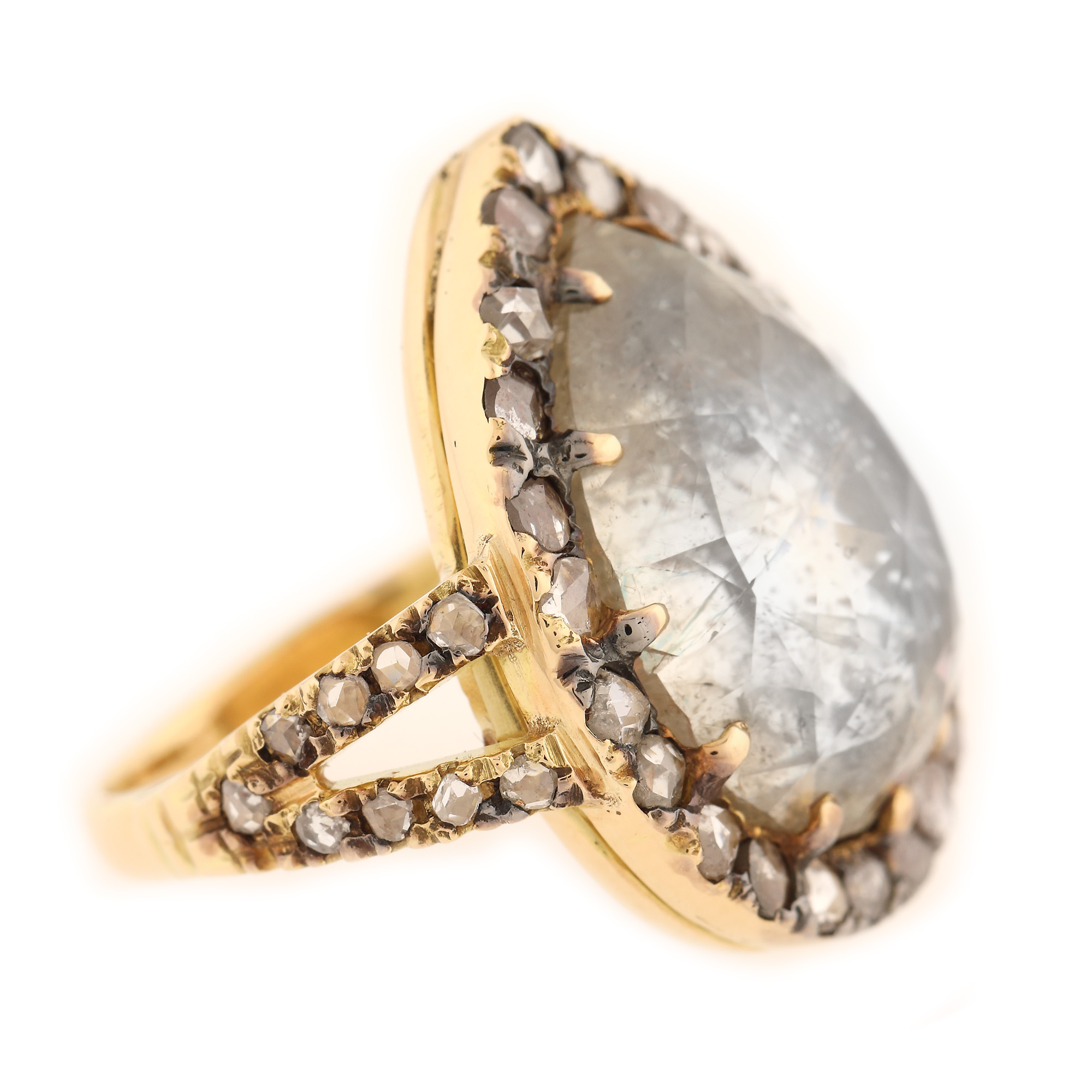 1 diamant pară fațetat, culoare J-K, fracture filled, cca. 15,90 ct. și 41 diamante rose cut, culoare J-M, claritate VS2-I2, cca. 0,60 ct.