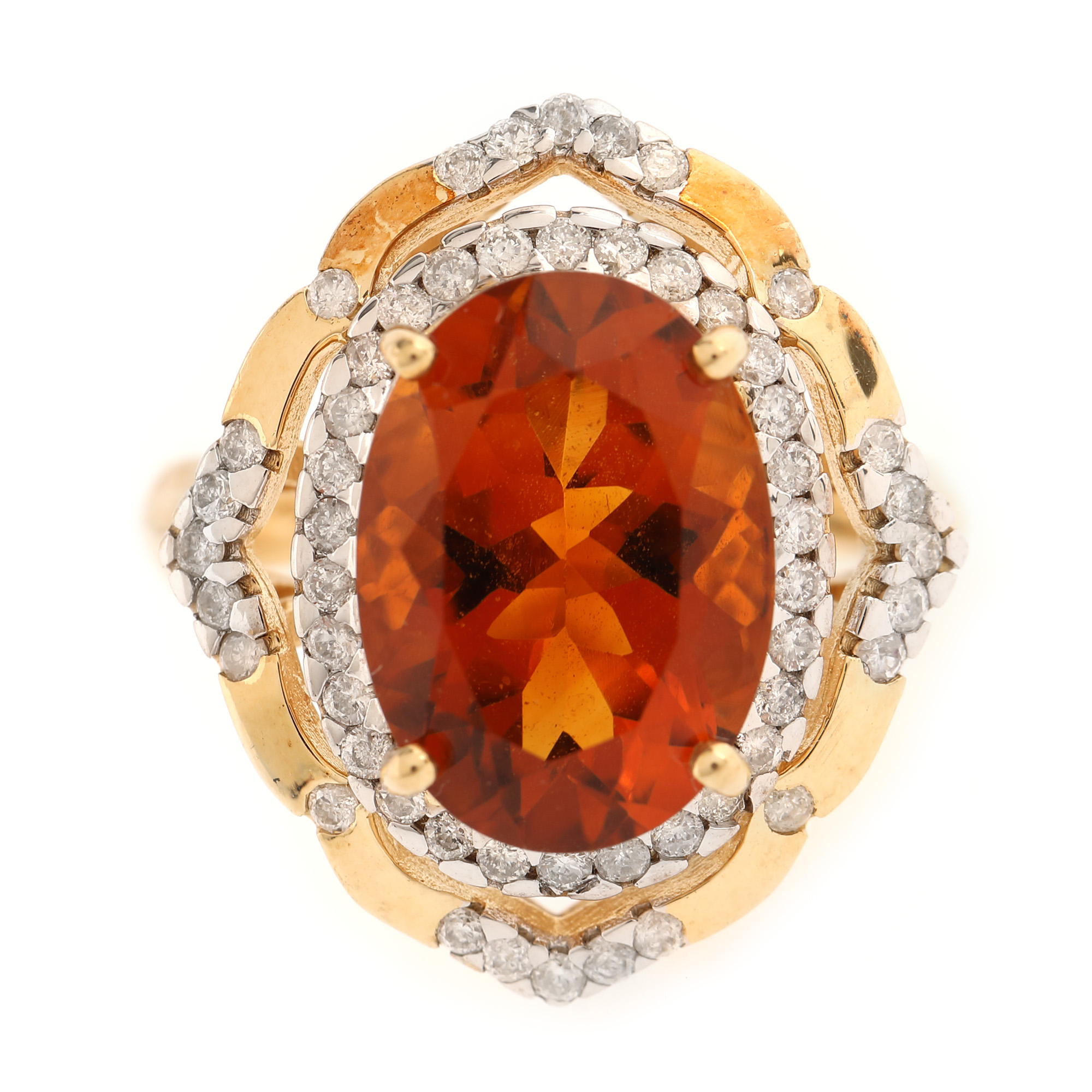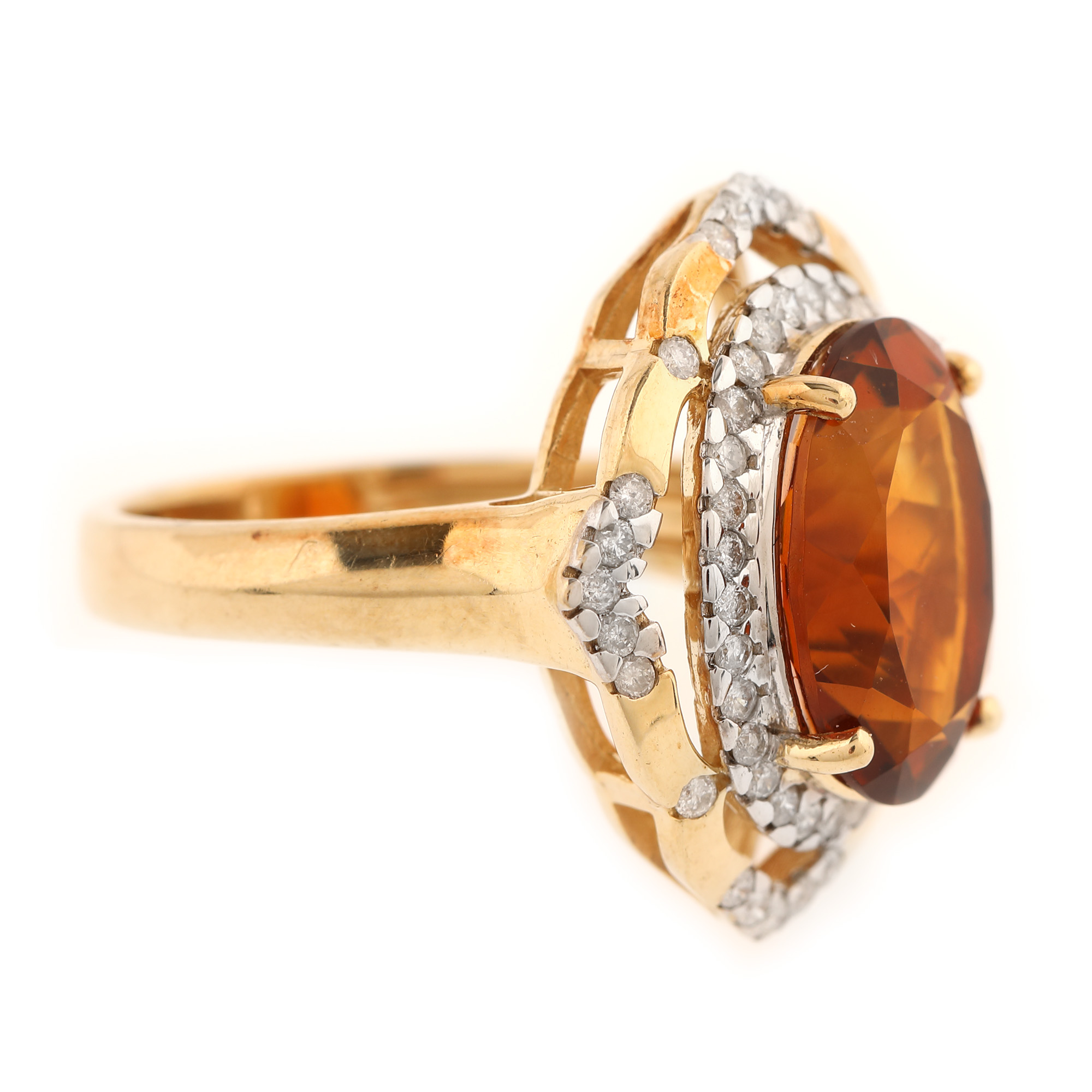1 citrin Madeira oval fațetat, culoare galben-portocaliu, claritate eye-clean, cca. 4,90 ct. și 54 diamante rotunde briliant, culoare H-J, claritate I2-I3, cca. 0,54 ct.