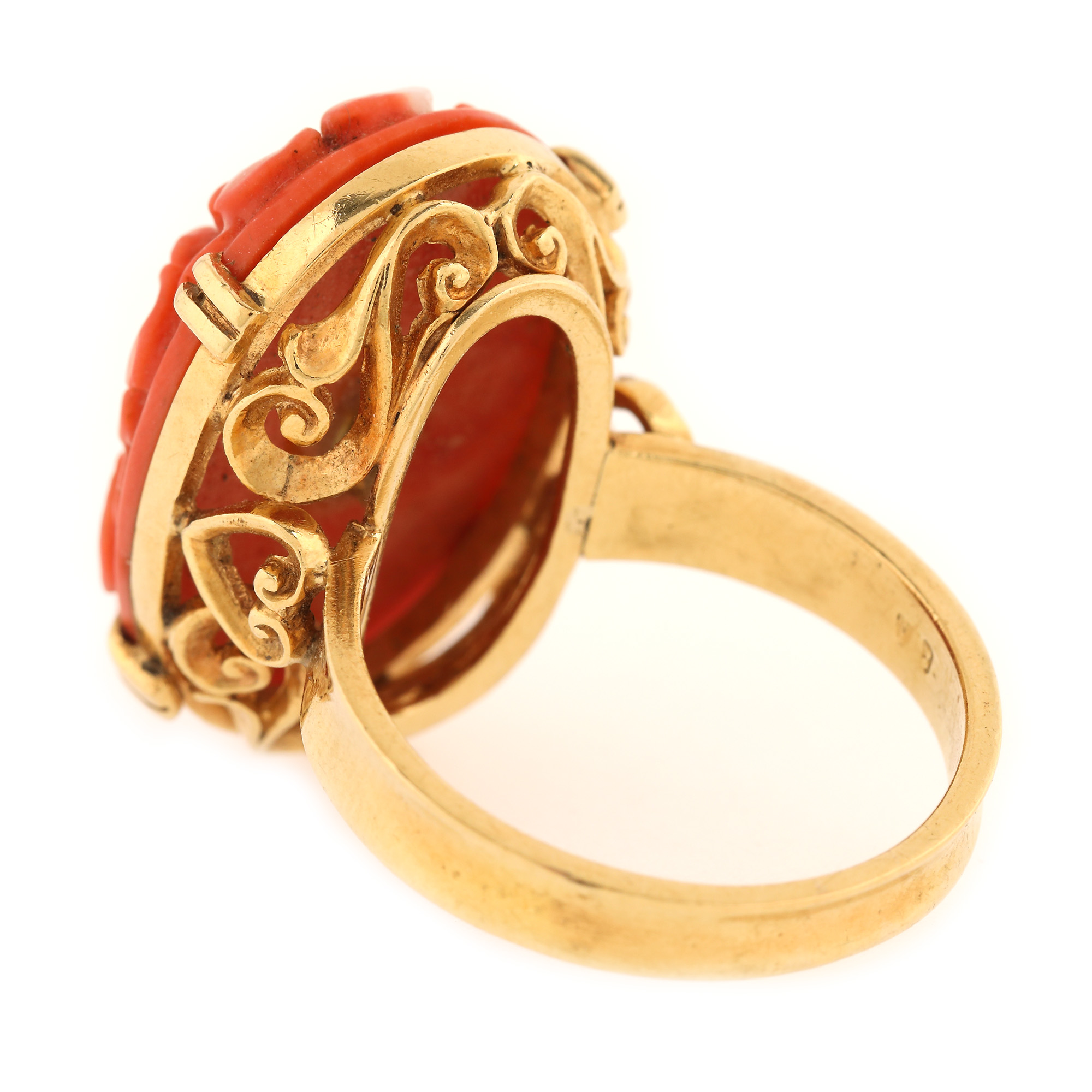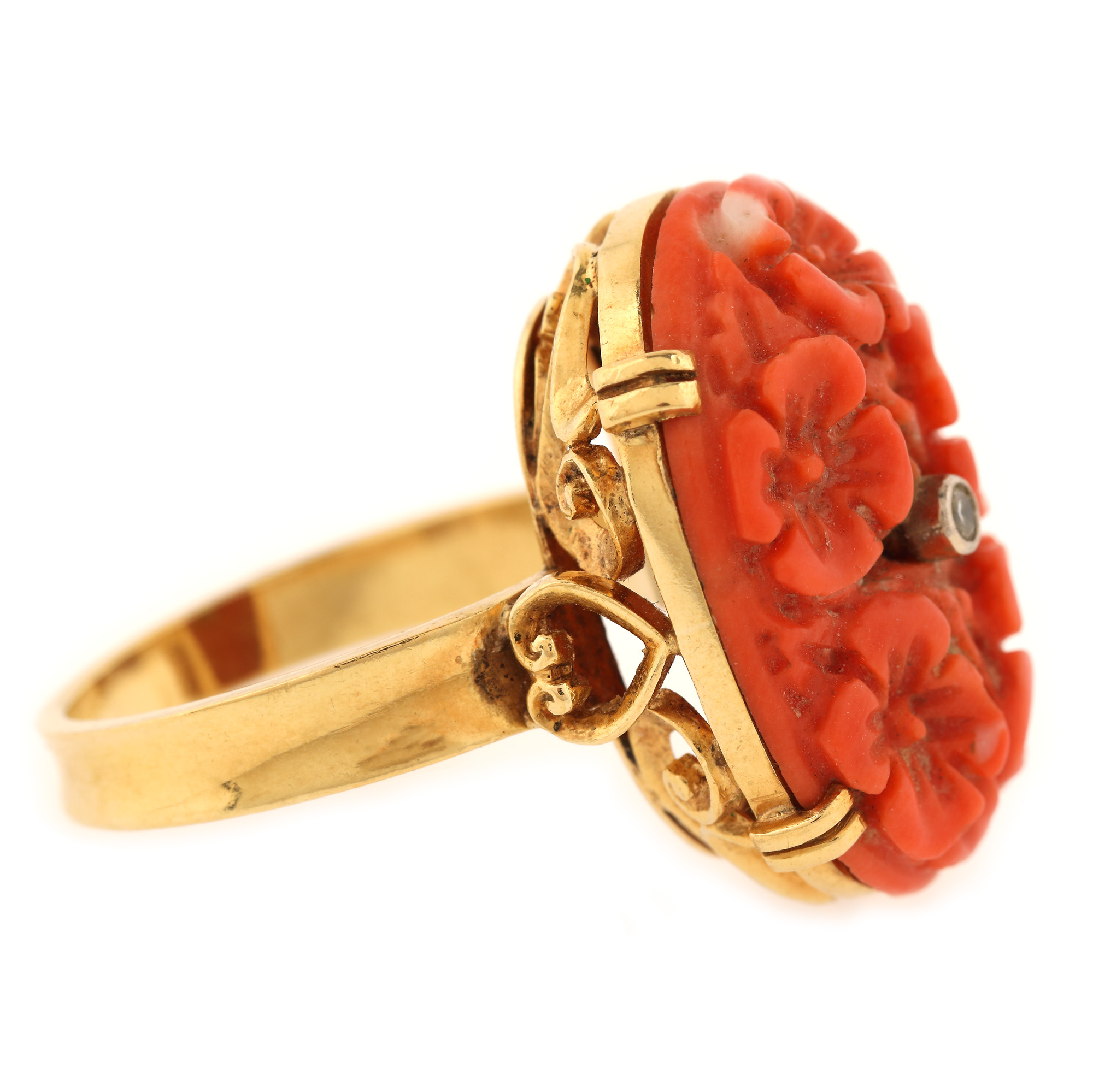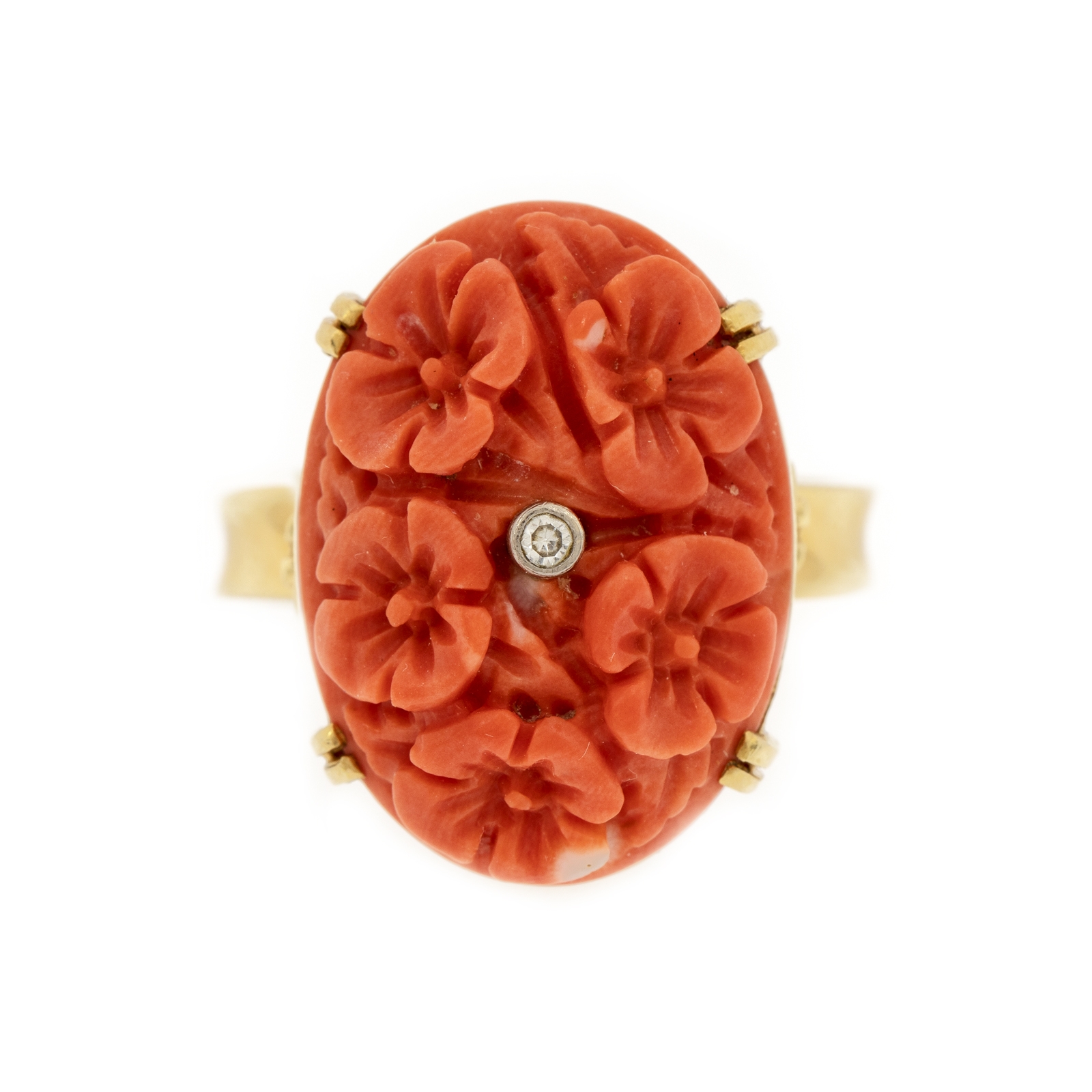 54. Inel din aur, decorat cu coral sculptat și diamant briliant, provine din colecția Marinei Dimitropoulos
