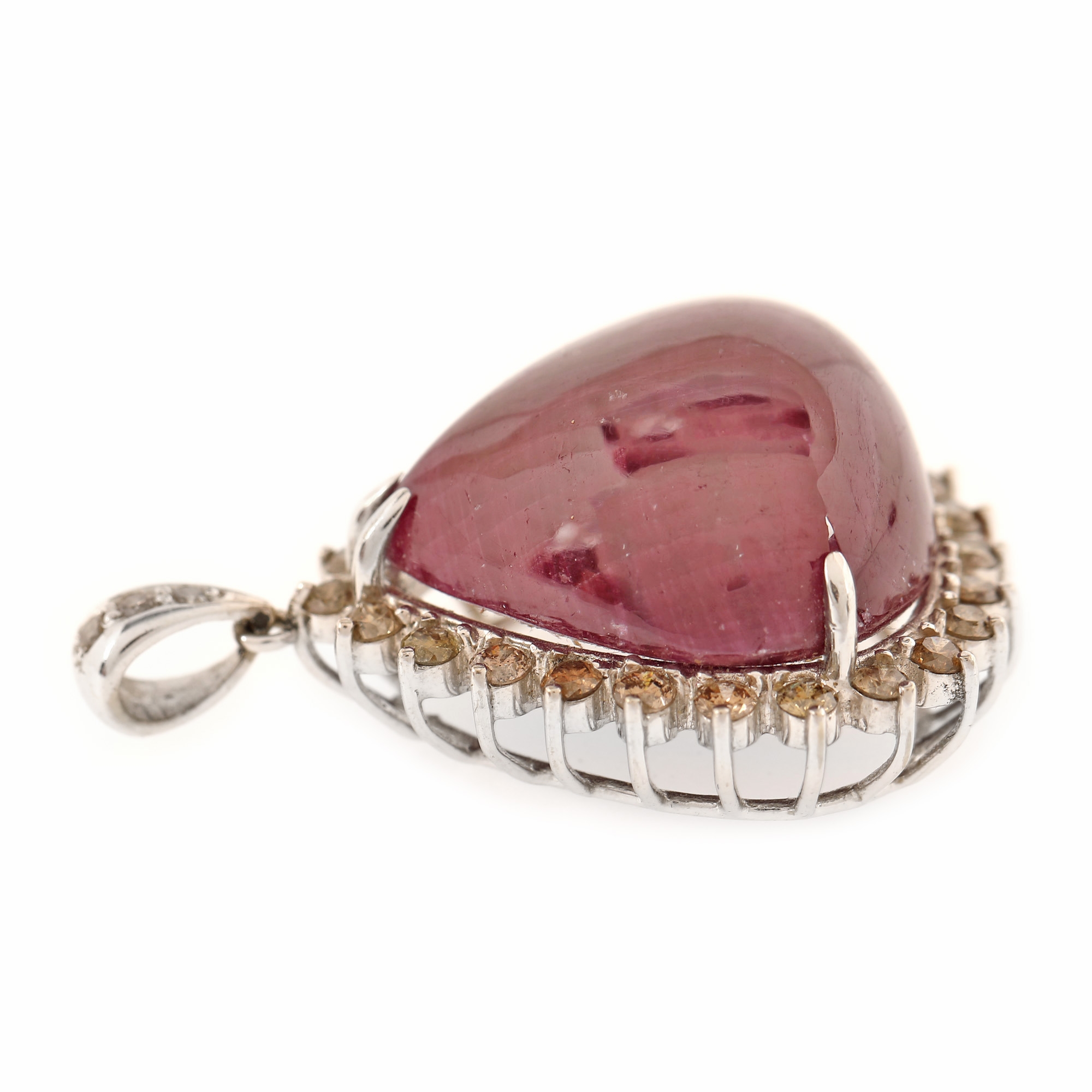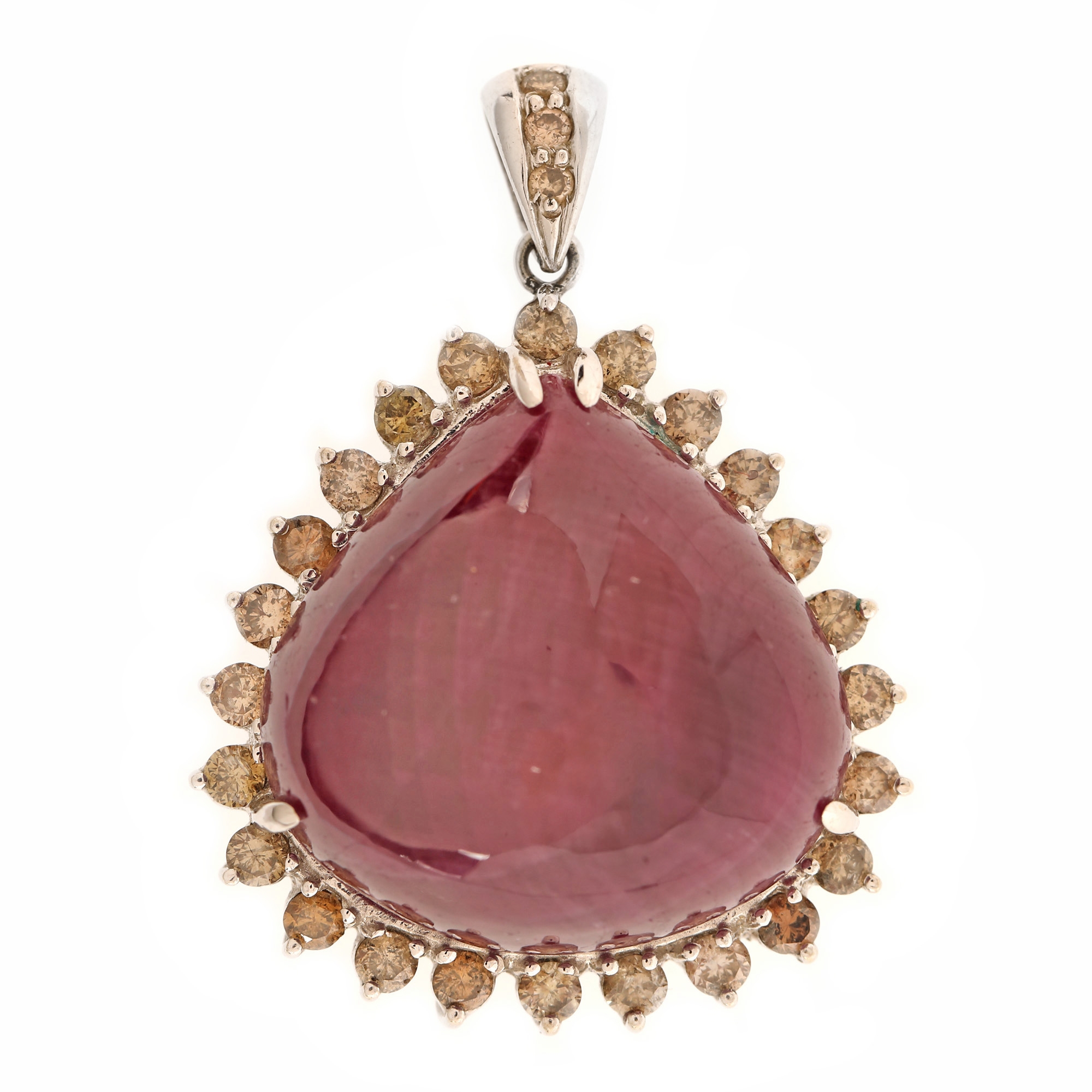 1 rubin pară caboșon, culoare roșu-violet, claritate heavily included, cca. 40.00 ct. și 27 diamante rotunde briliant, culoare maro, claritate I2-I3, cca. 1.00 ct.