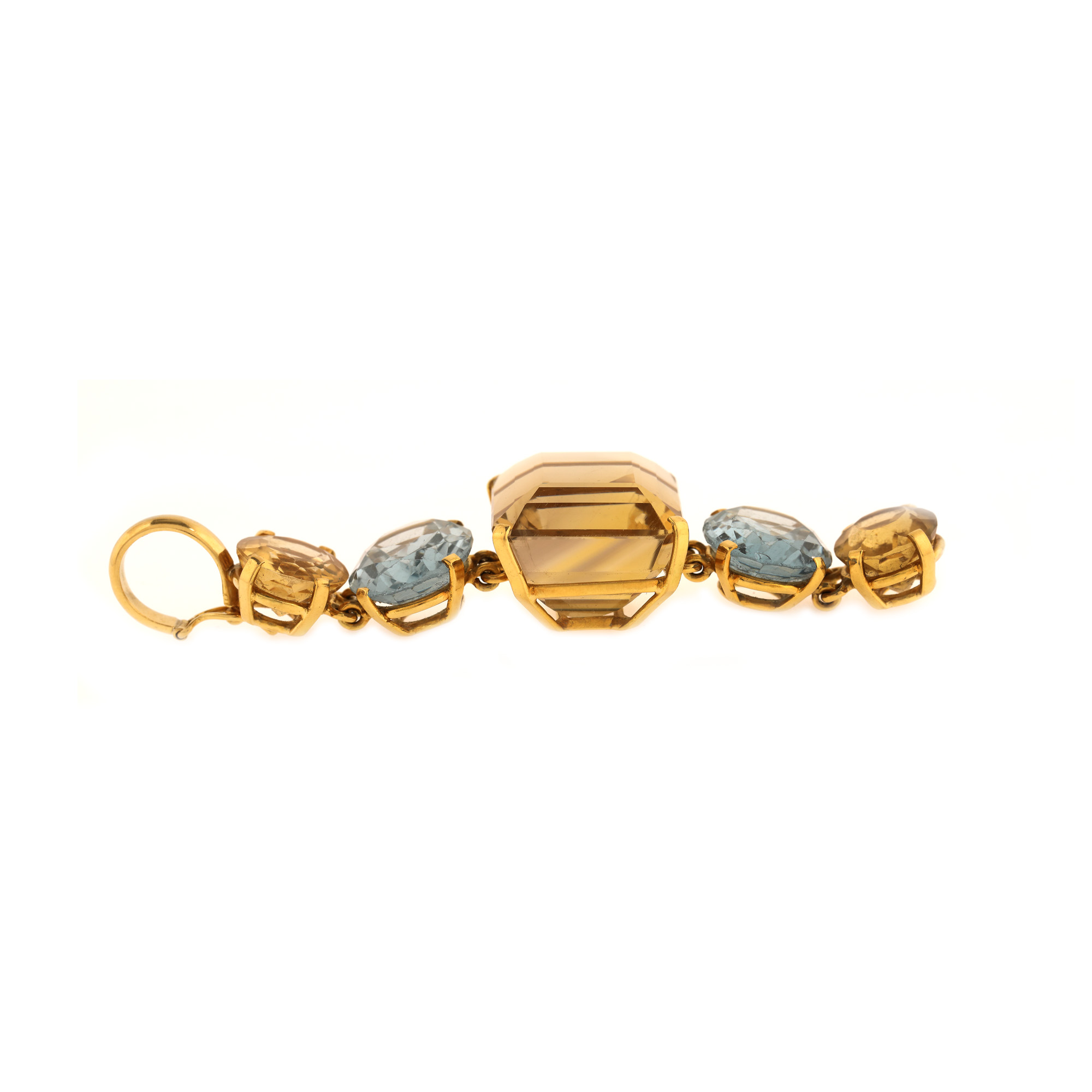 3 citrine (2 oval fațetate, 1 emerald cut), culoare galben, claritate eye-clean, cca. 79 ct. și 2 spinele sintetice, culoare bleu