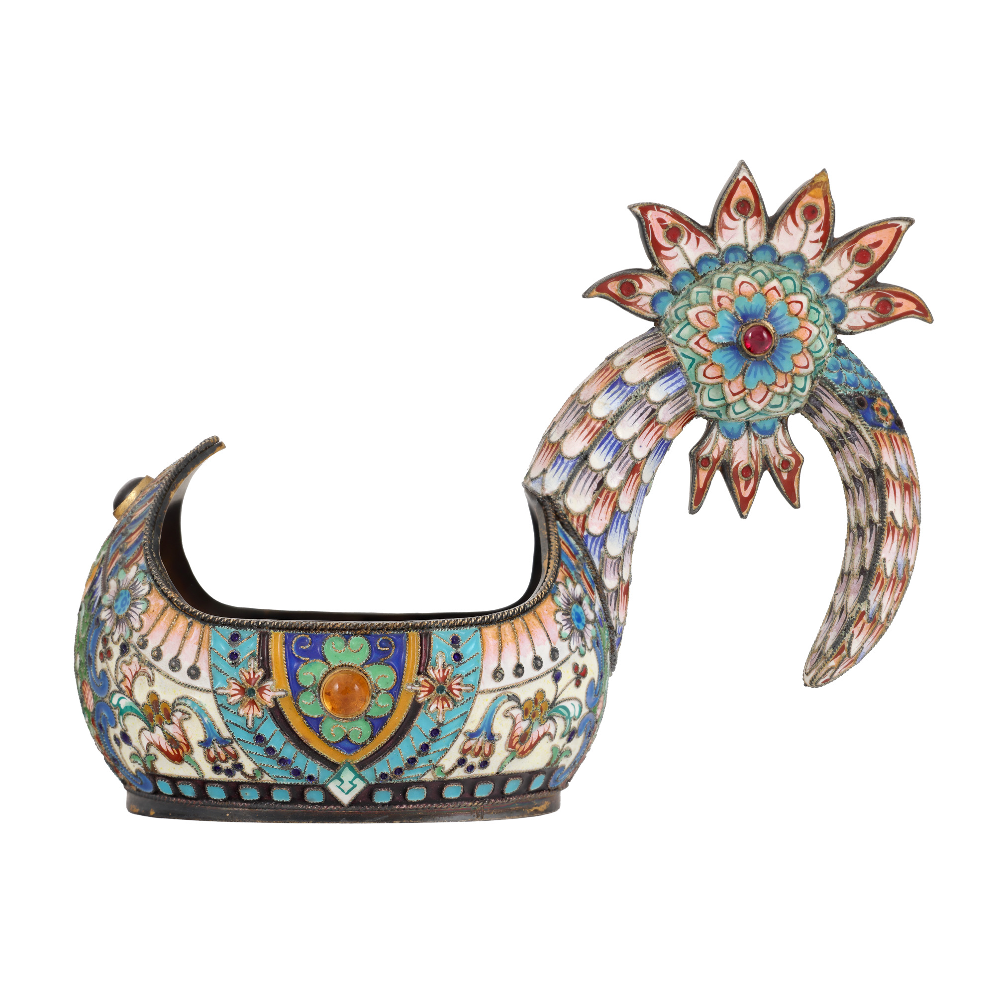 23. Kovsh din argint, sub forma unei păsări exotice, decorat cu email în manieră rusească