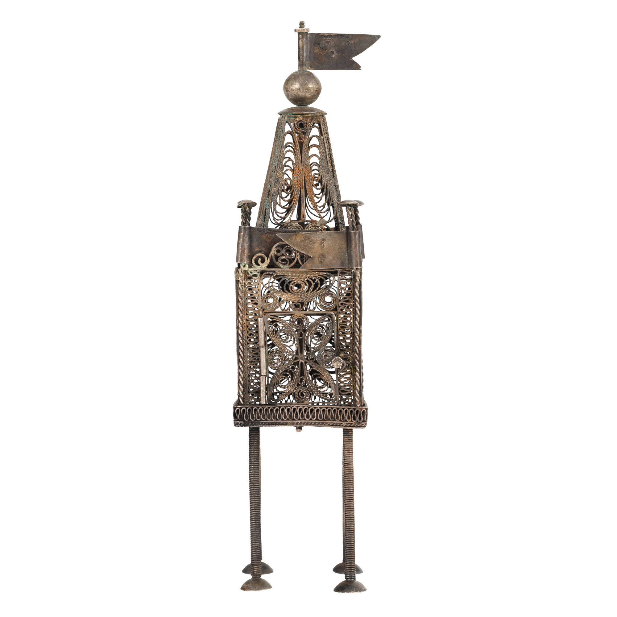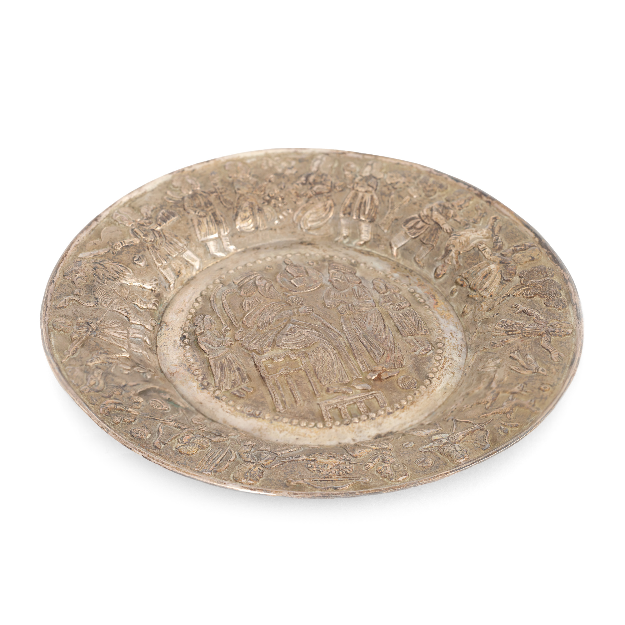 6. Centru de masă din argint, decorat cu scene zoroastriene și inscripții în ebraică, cca. 1940