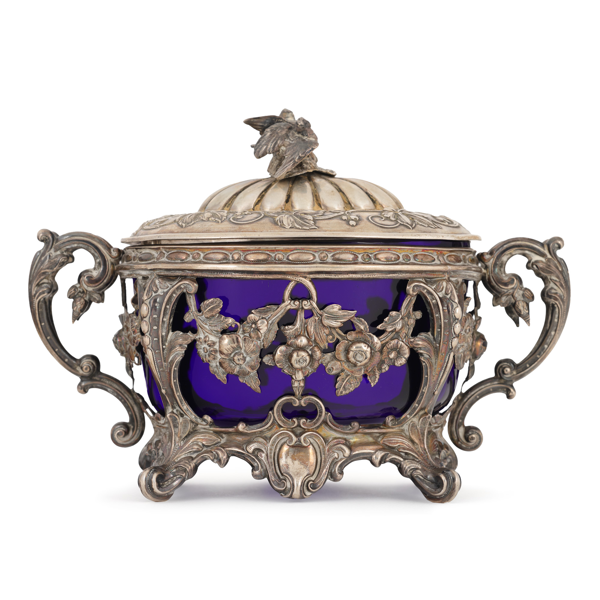 30. Bombonieră din argint și sticlă cobalt, decorat cu turturele, cca. 1880