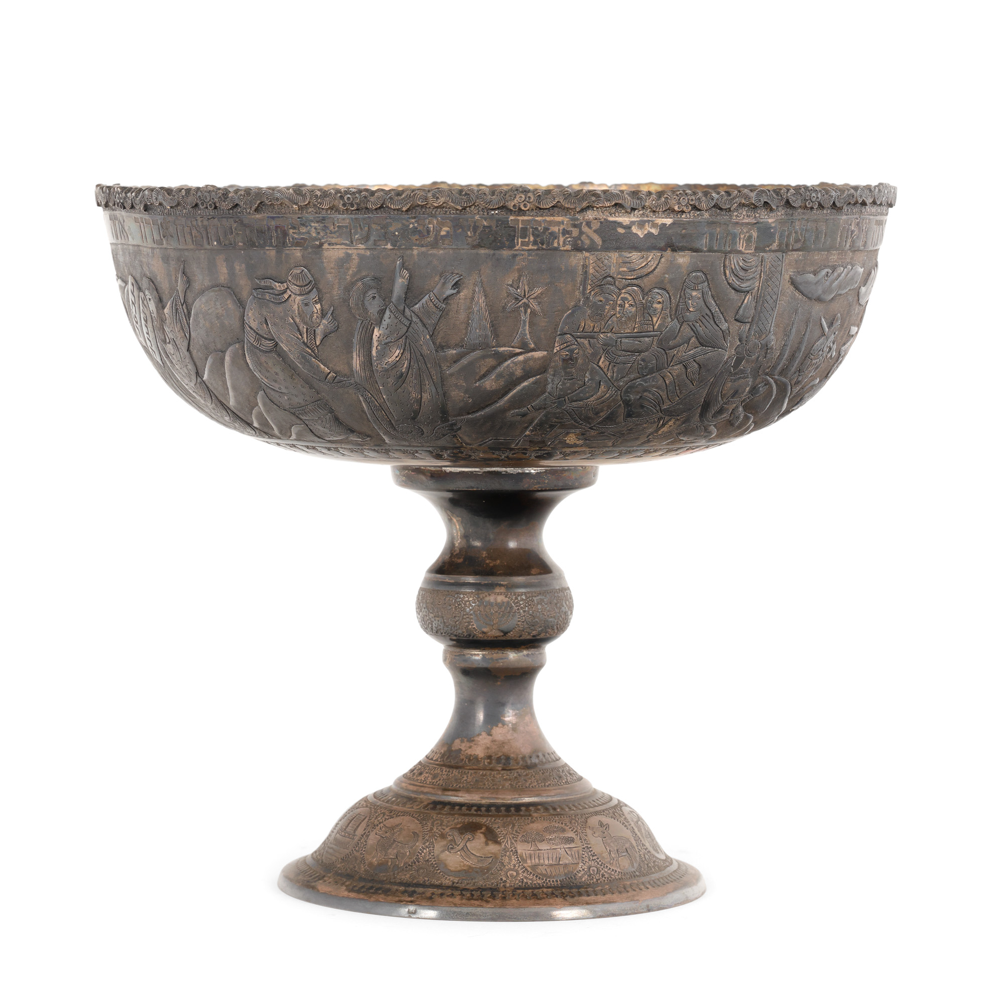 3. Centru de masă din argint, decorat cu scene zoroastriene și inscripții în ebraică, cca. 1940