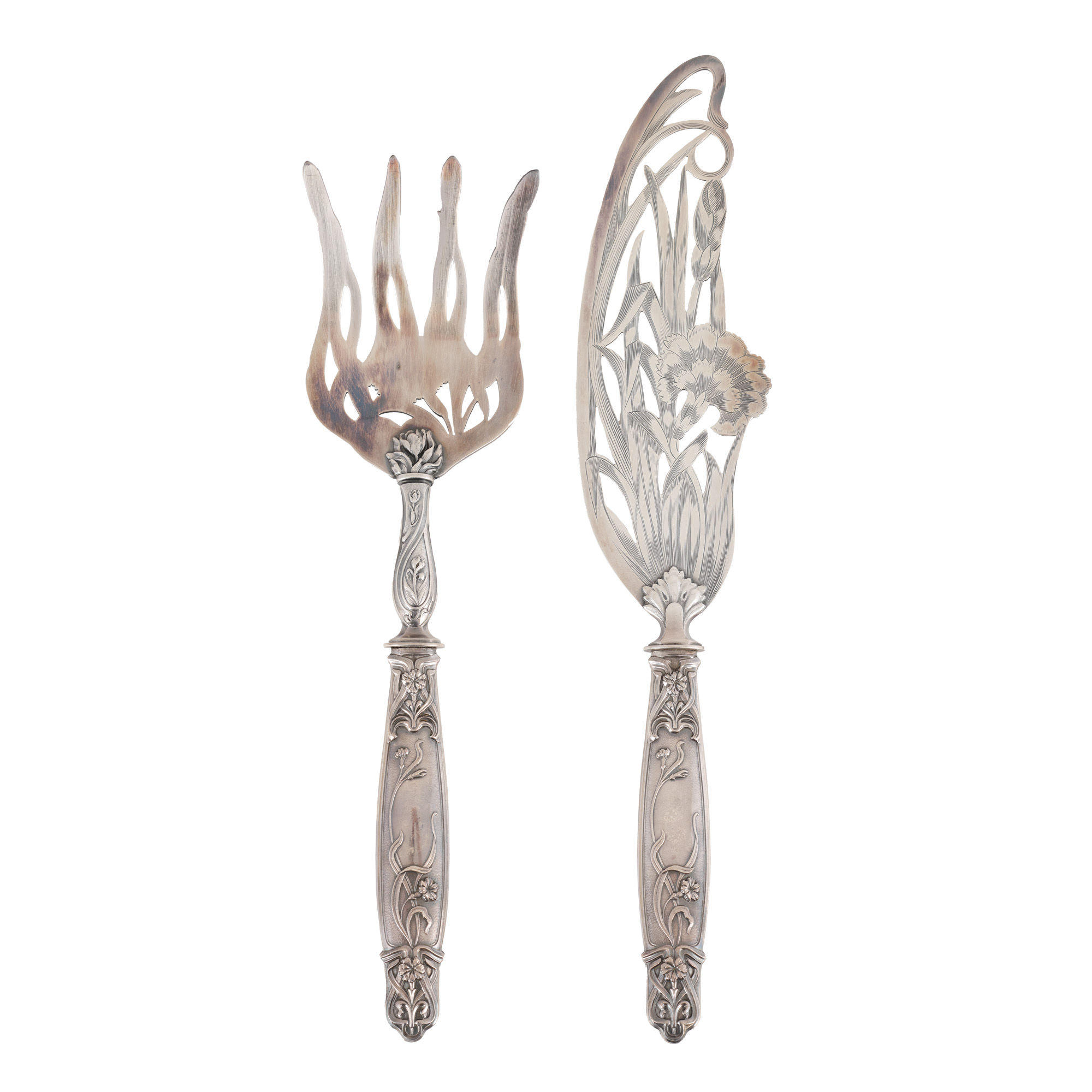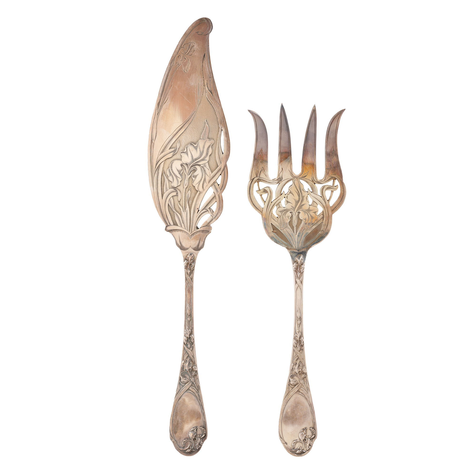 7. Set Art Nouveau pentru servirea tortului, din argint, decorat cu flori de iris, cca. 1900
