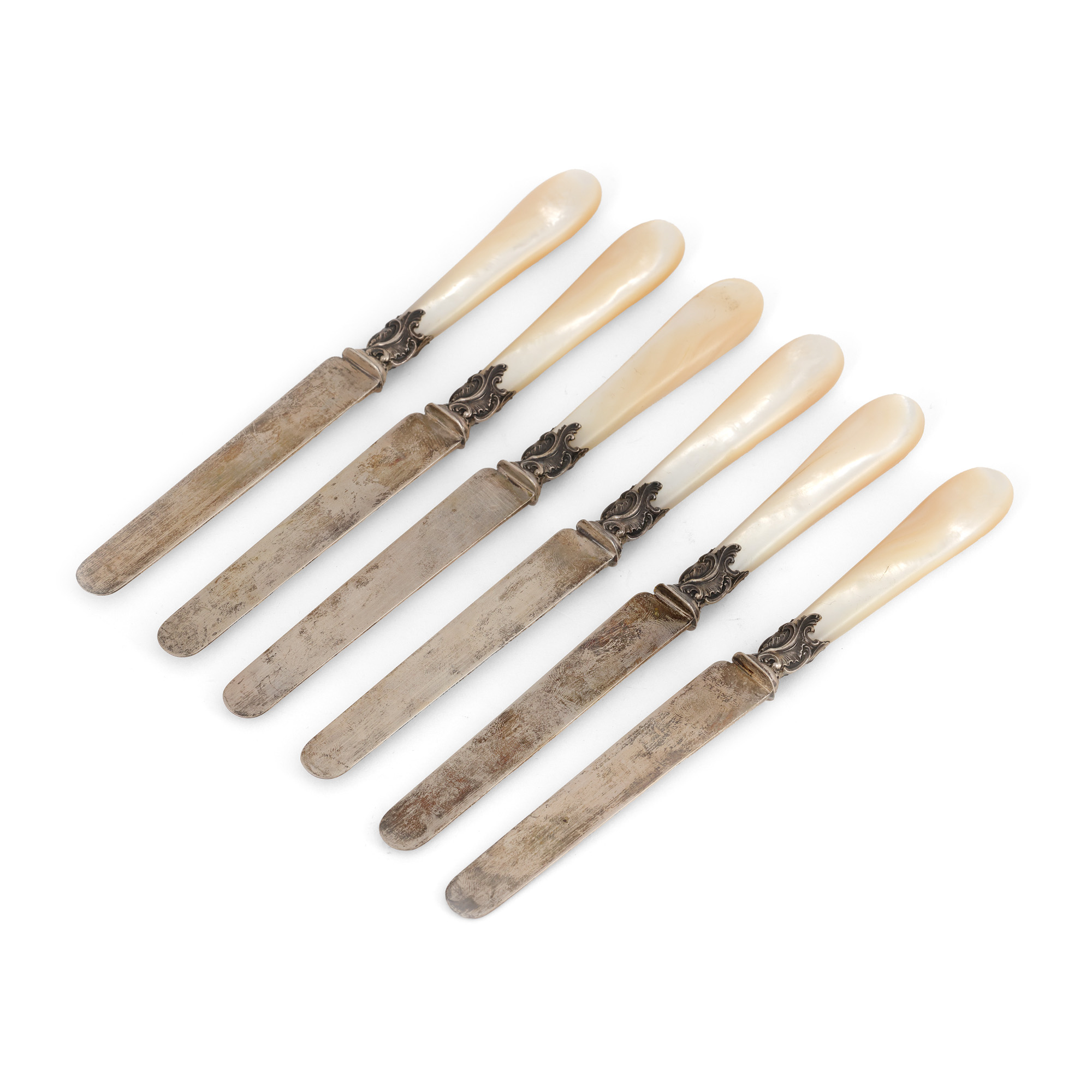 20. Lot format din șase cuțite din argint, cu mâner din sidef
