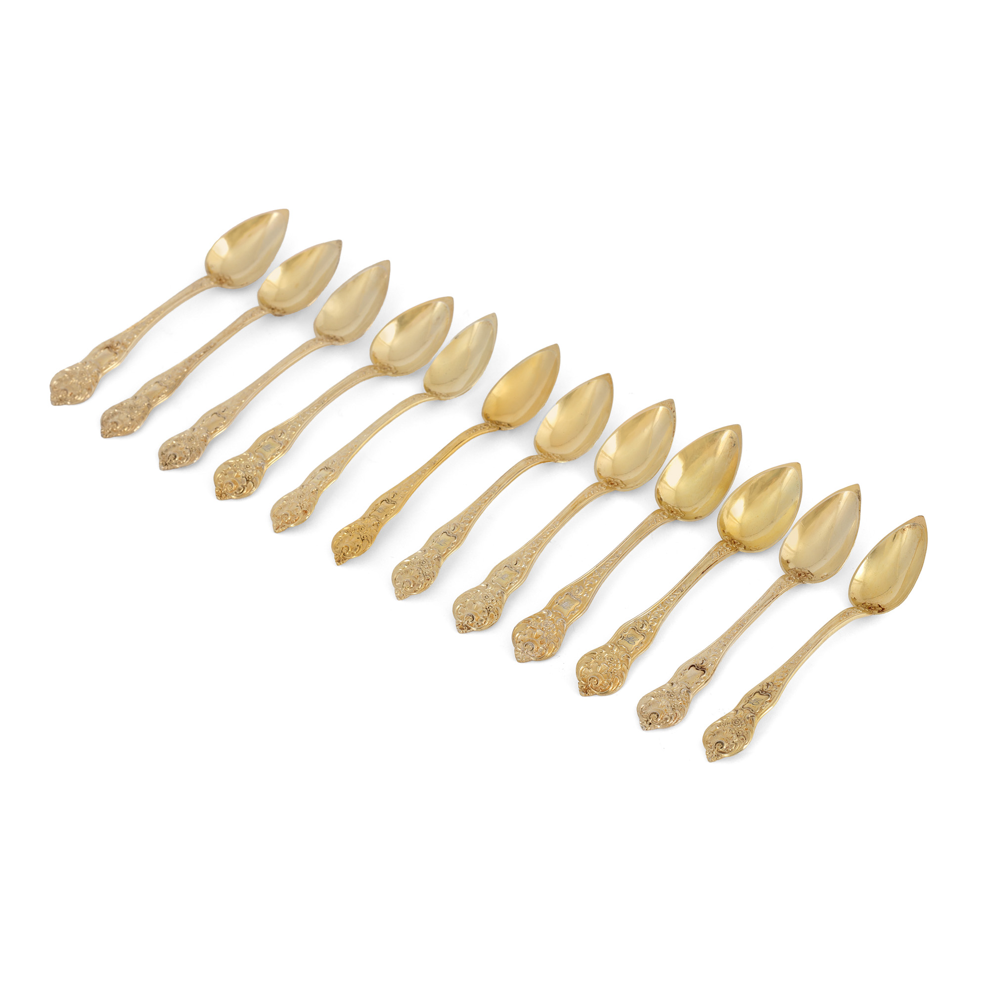 21. Set de 12 lingurițe pentru ceai, din argint aurit, însoțite de cutie, cca. 1900