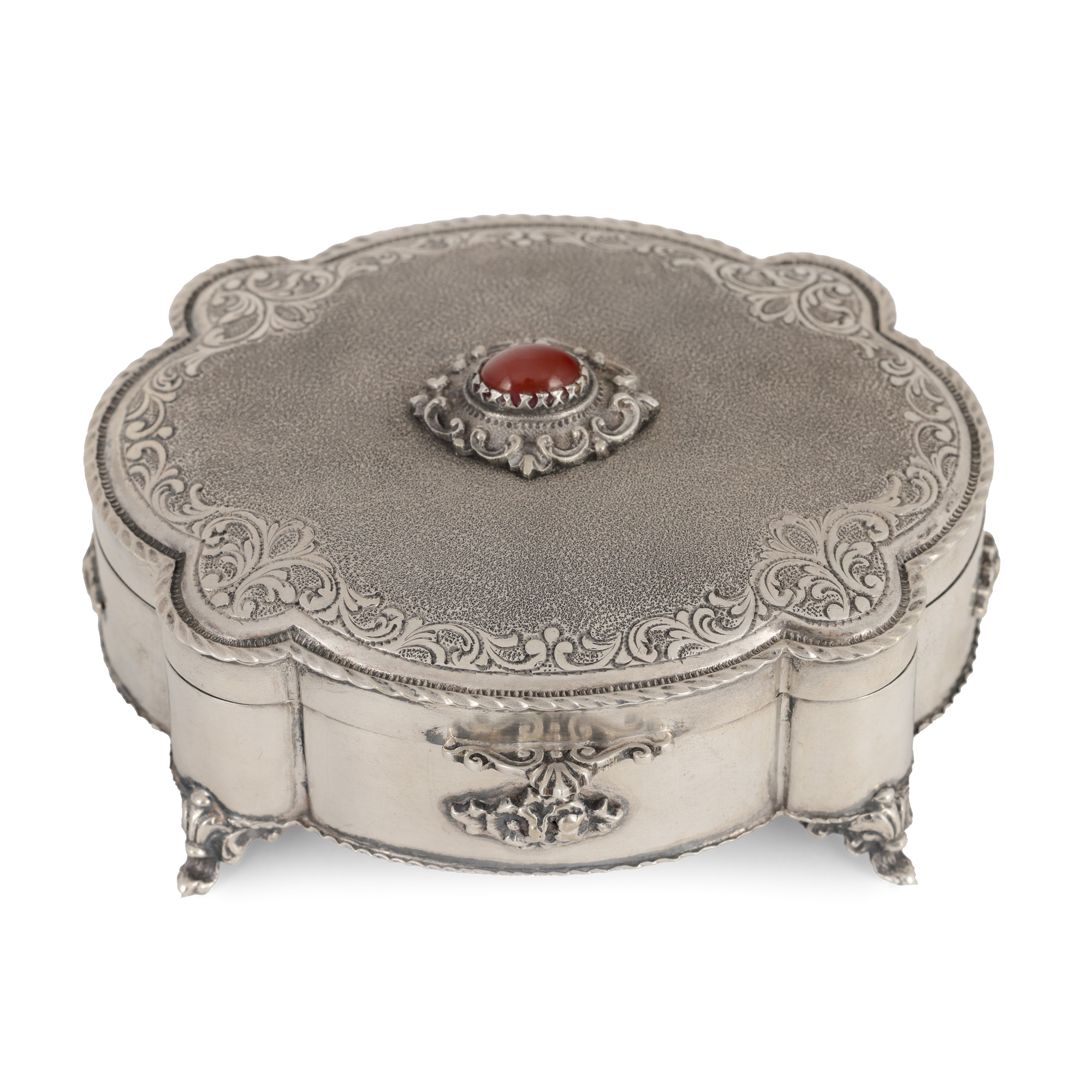 28. Casetă pentru bijuterii din argint și argint aurit, decorată cu carneol