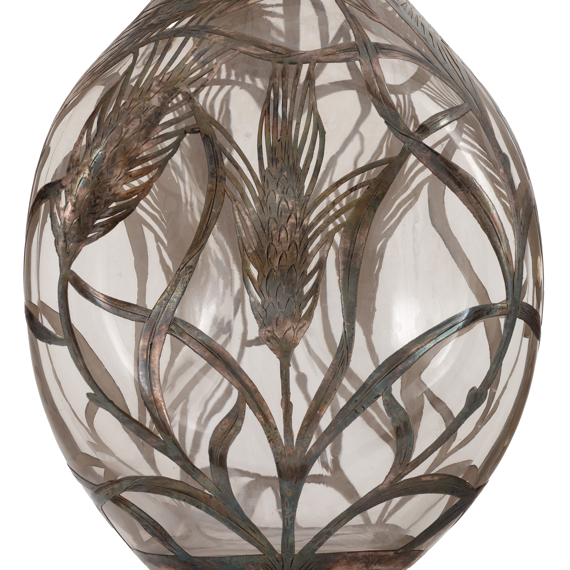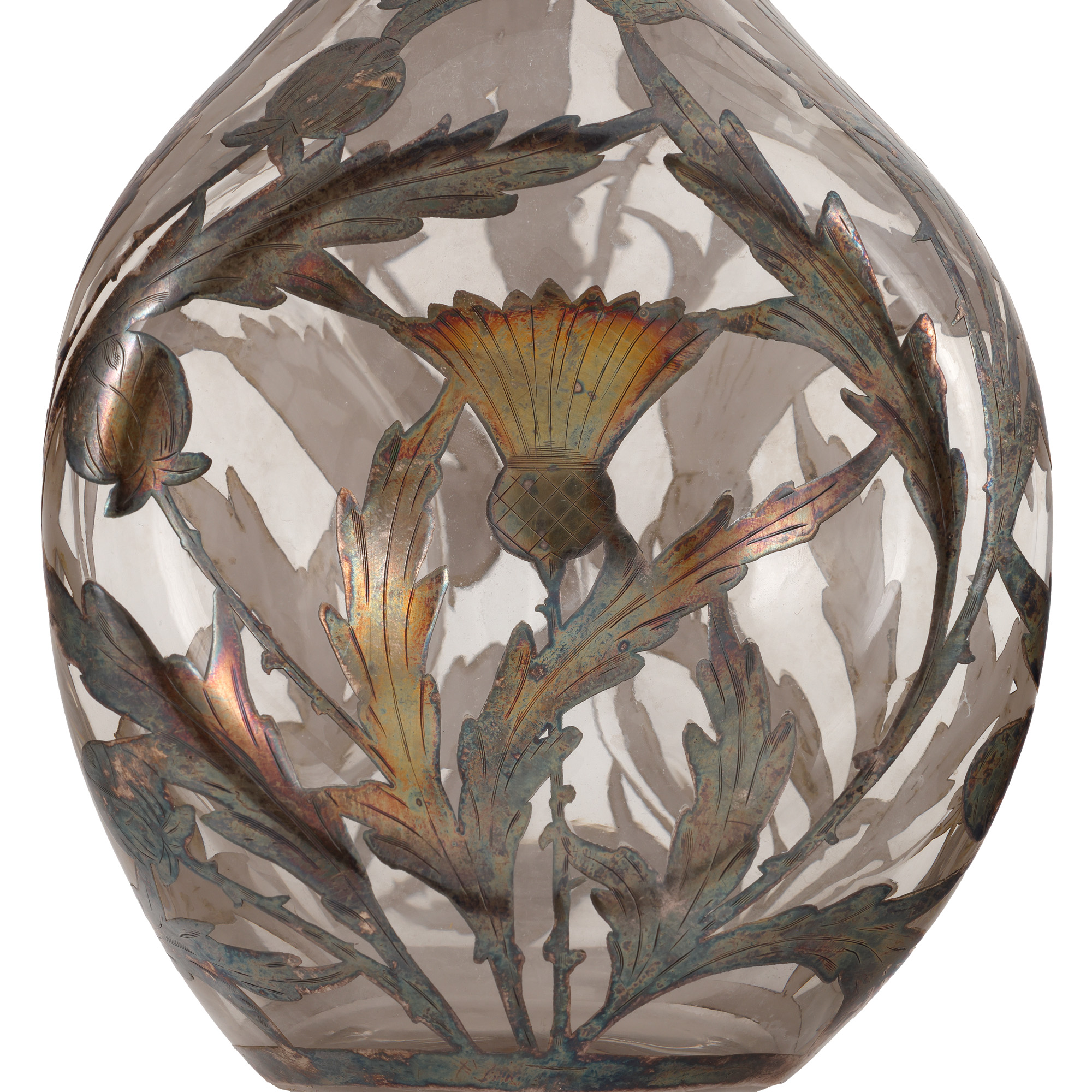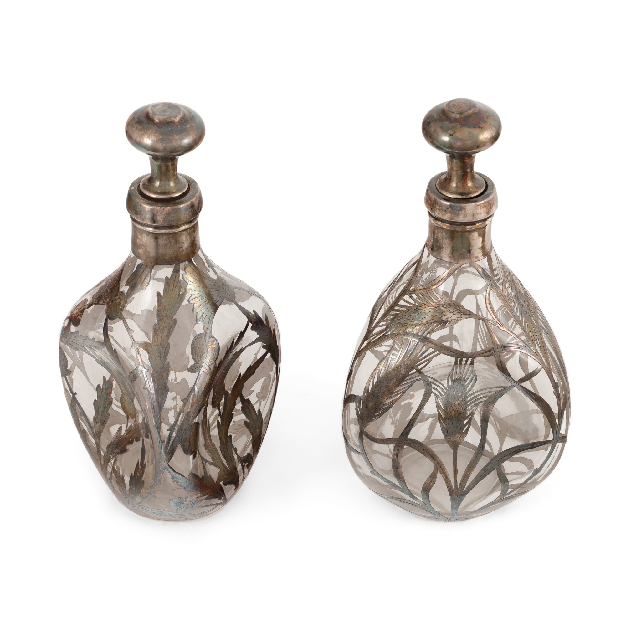 29. Pereche de decantoare din sticlă, minuțios decorate cu foiță din argint