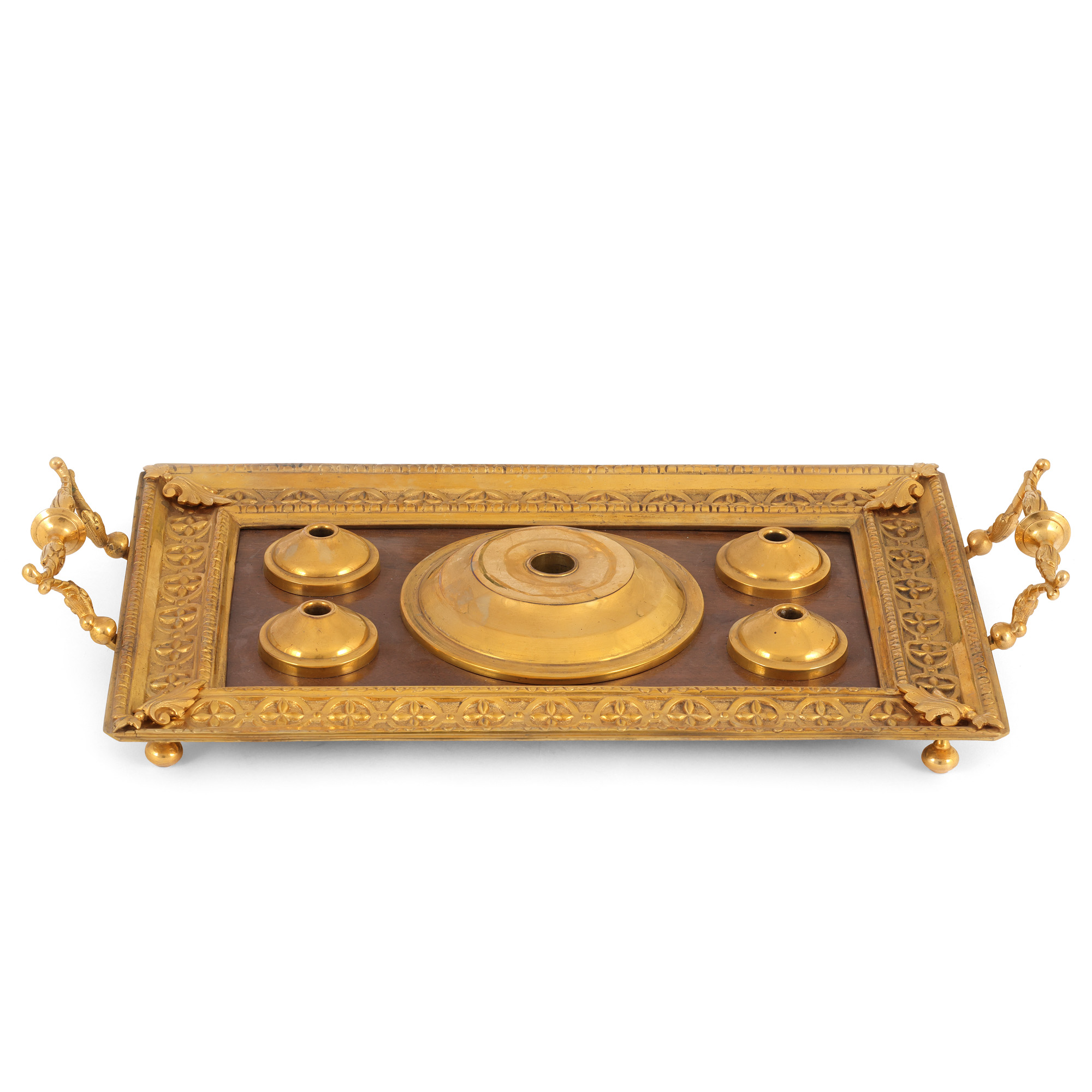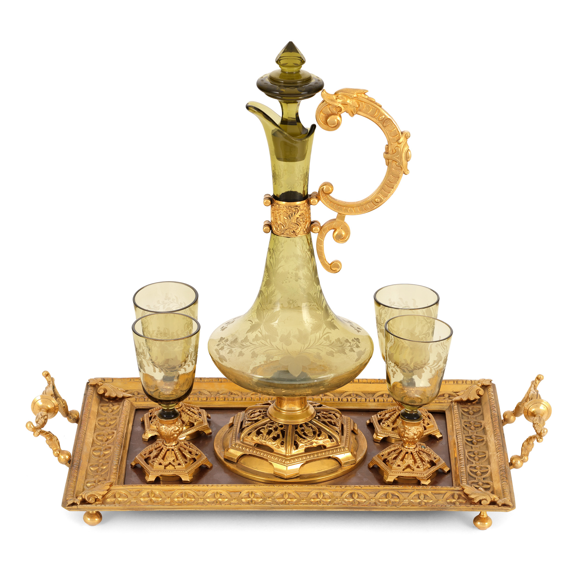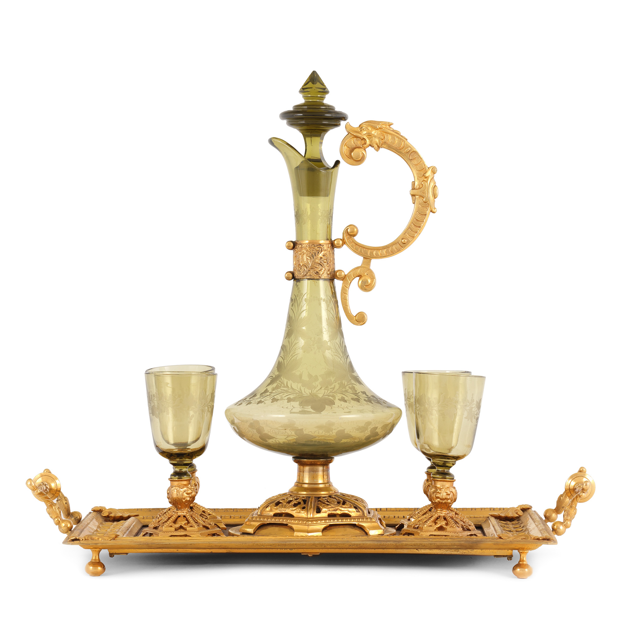 56. Serviciu pentru aperitive din bronz doré și cristal, format din carafă, patru pahare și tavă