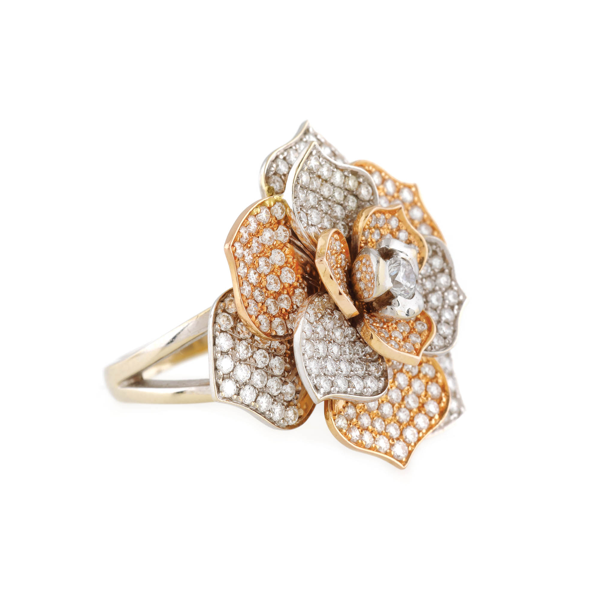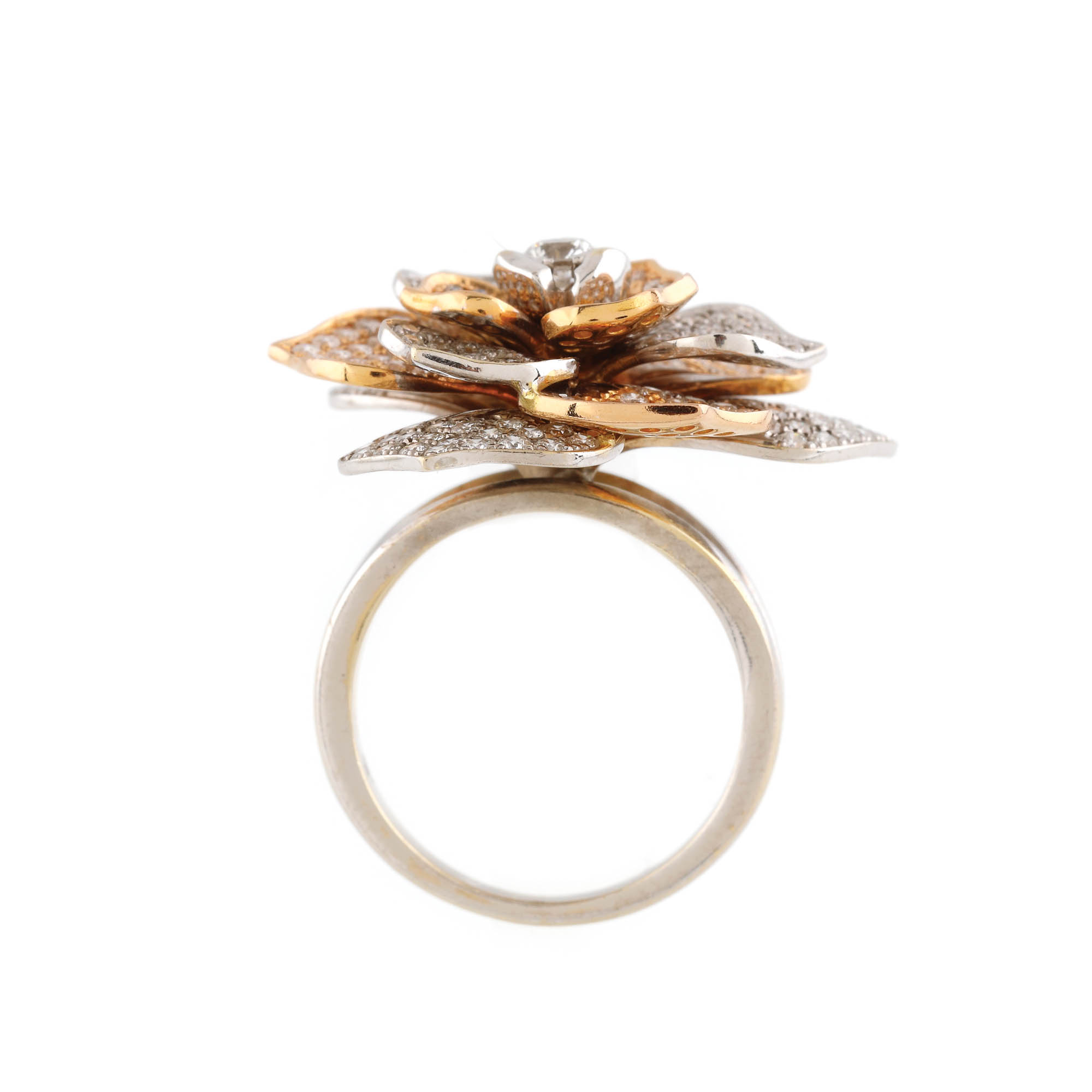 22. Amplu inel din aur în două culori, în forma unei flori presărate cu diamante