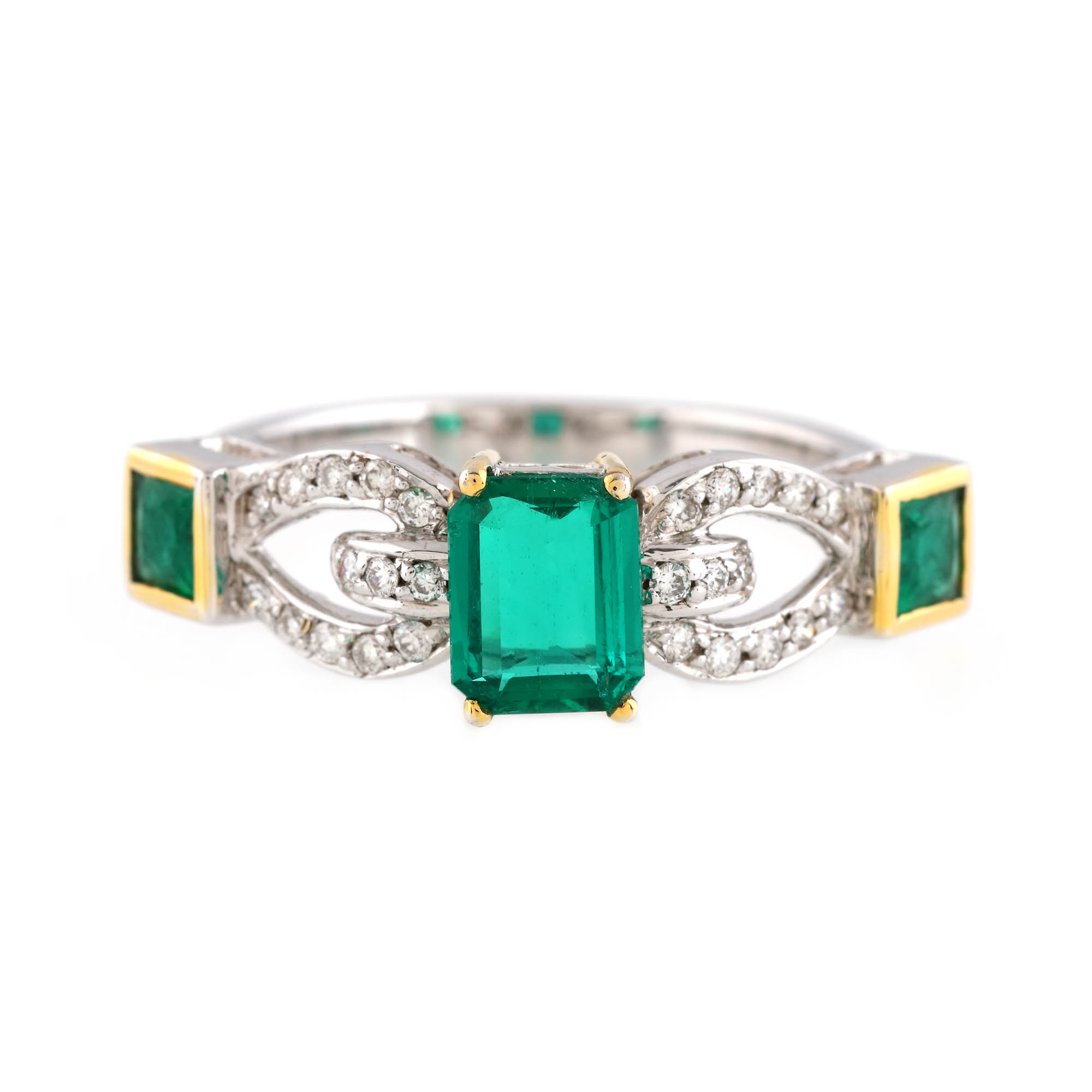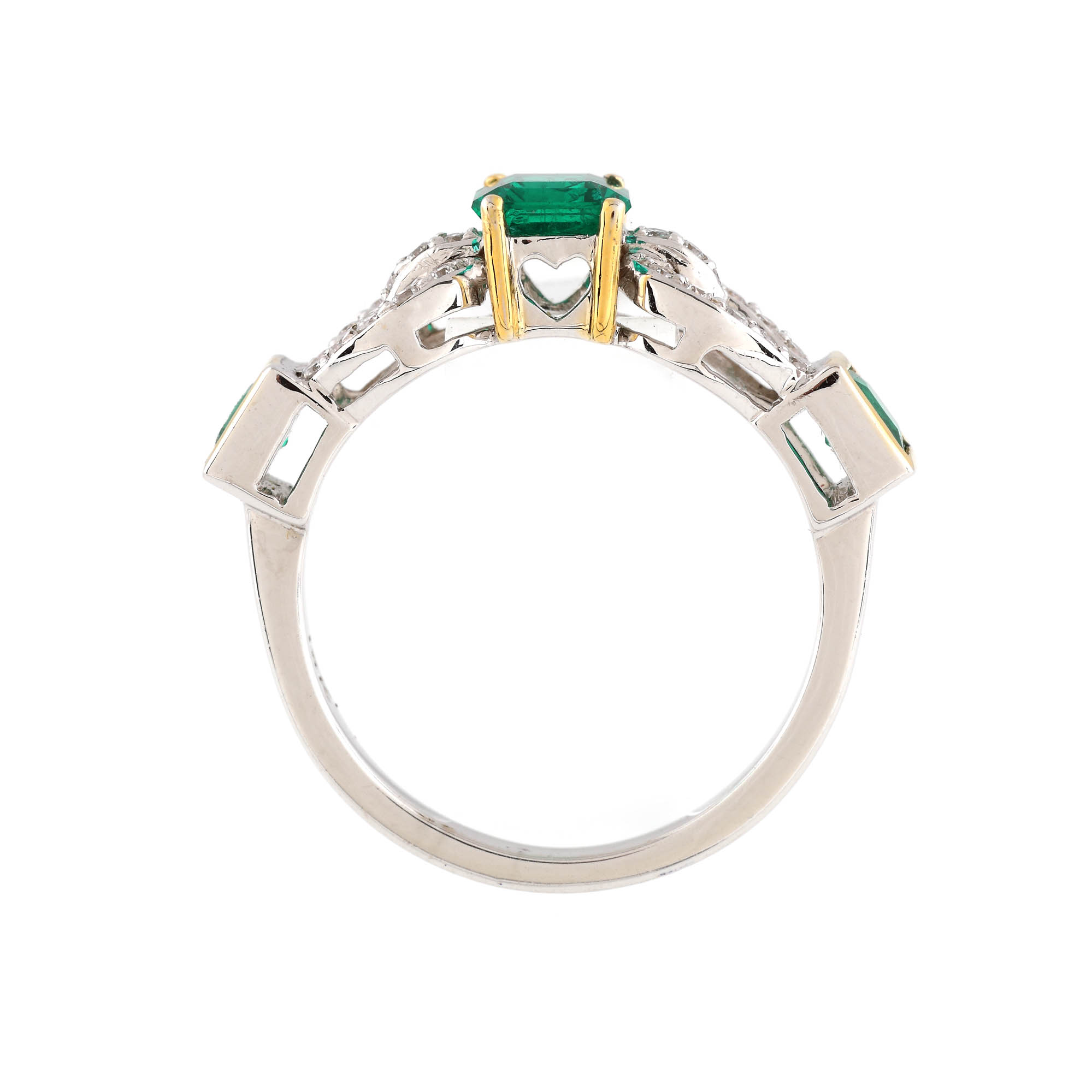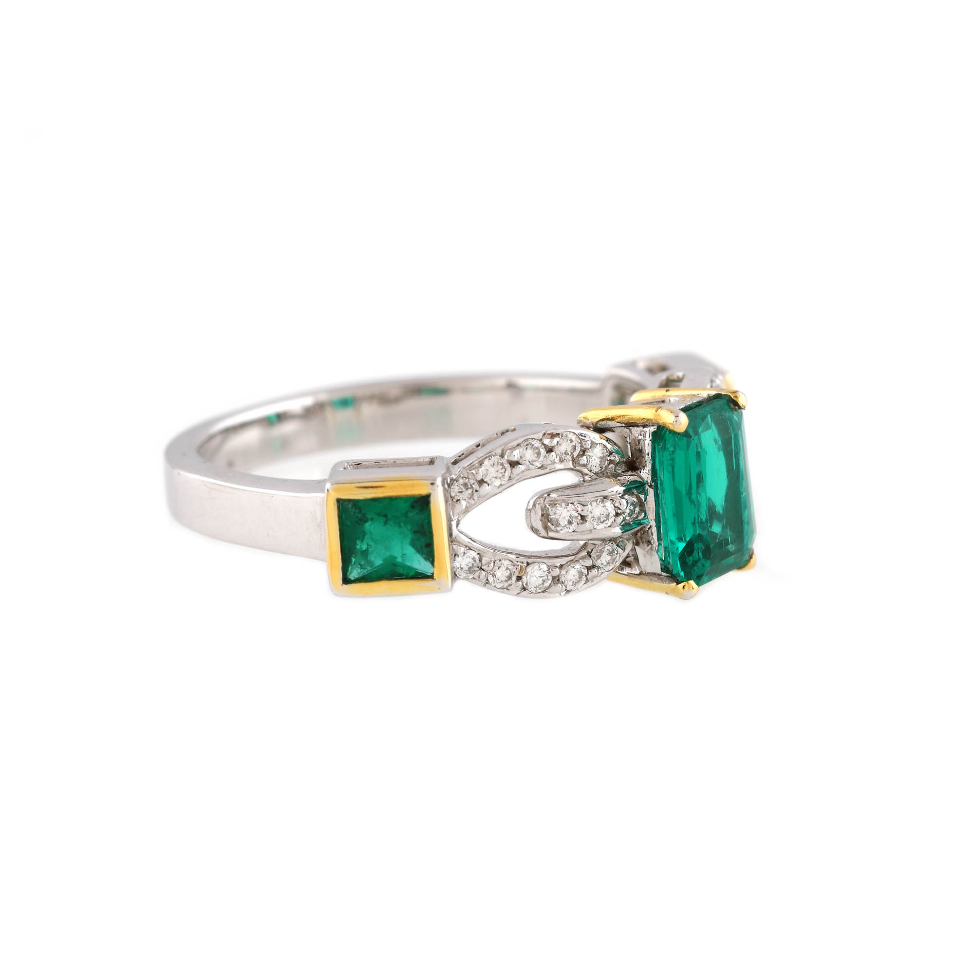 3 smaralde (1 emerald cut, 2 pătrat fațetate), culoare verde, claritate eye-clean, SI, cca. 1,0 ct. și 26 diamante rotunde briliant, culoare F-G, claritate VVS-VS, cca. 0,26 ct.