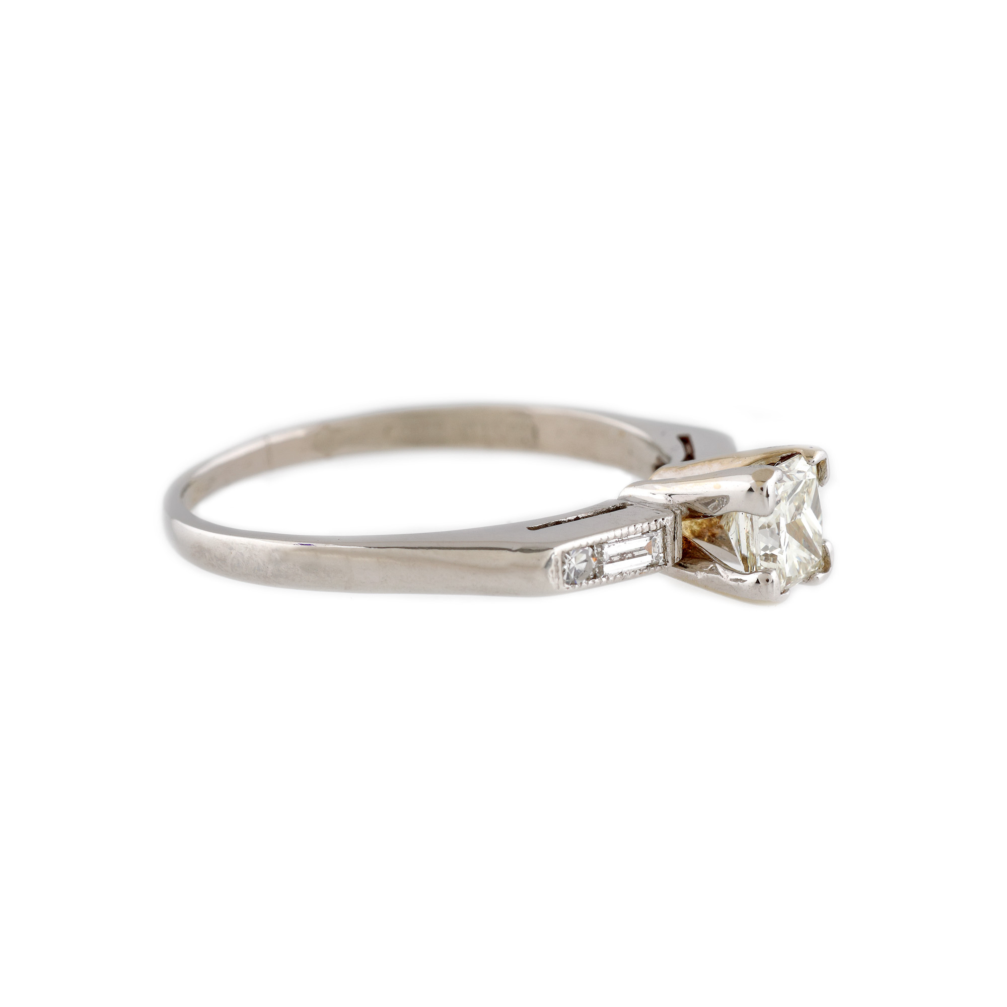 1 diamant princess cut, culoare J, claritate VS1, cca. 0,44 ct.; 2 diamante baghete, culoare G-H, claritate VS-SI1, cca. 0,11 ct. și 2 diamante single cut, culoare G-H, claritate VS, cca. 0,02 ct.