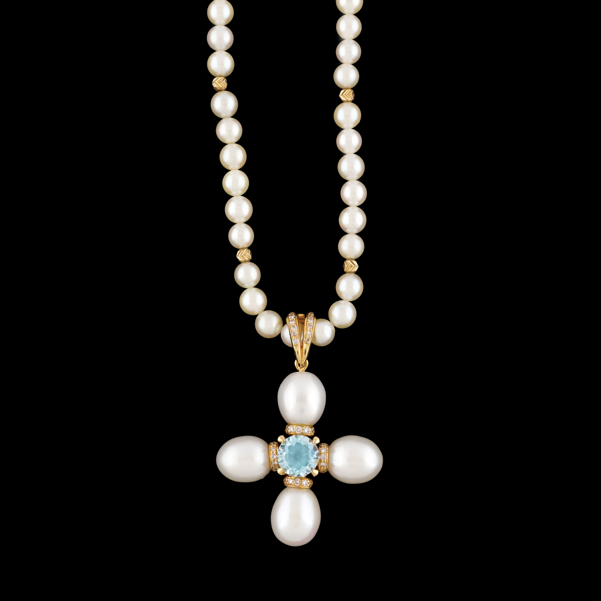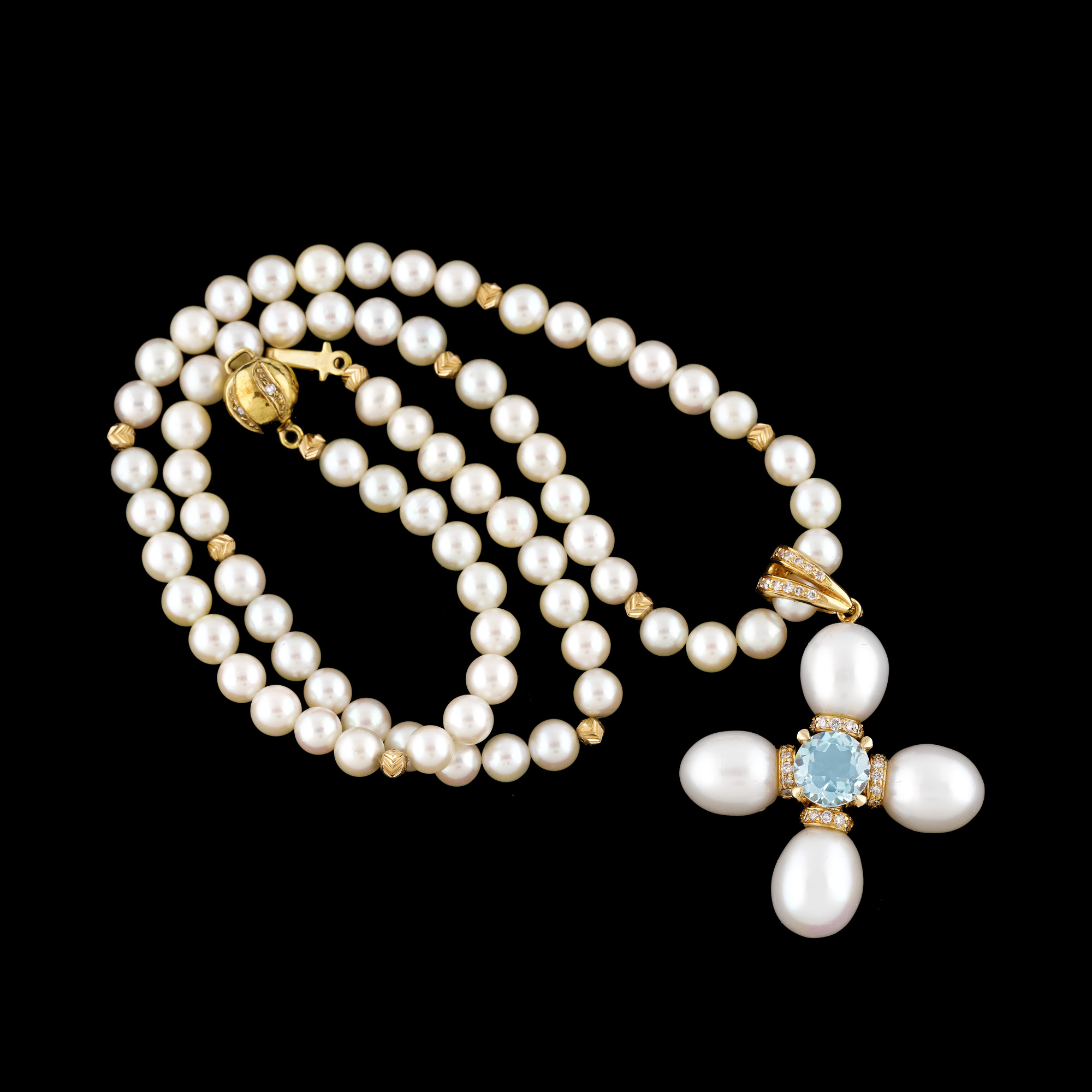 1 topaz rotund fațetat, culoare bleu, claritate eye-clean, cca. 1,9 ct; 36 diamante (32 rotunde briliant, 4 single cut), culoare I-J, claritate VS, cca. 0,3 ct. și 78 perle de cultură rotunde, culoare alb, d=4,28-9,56 mm.