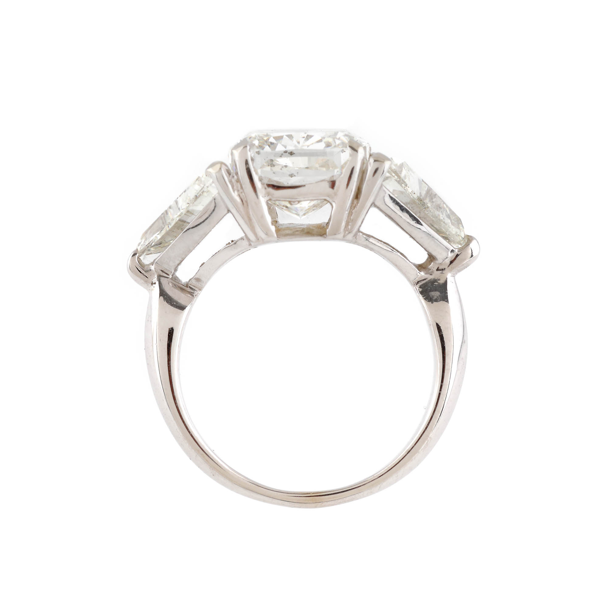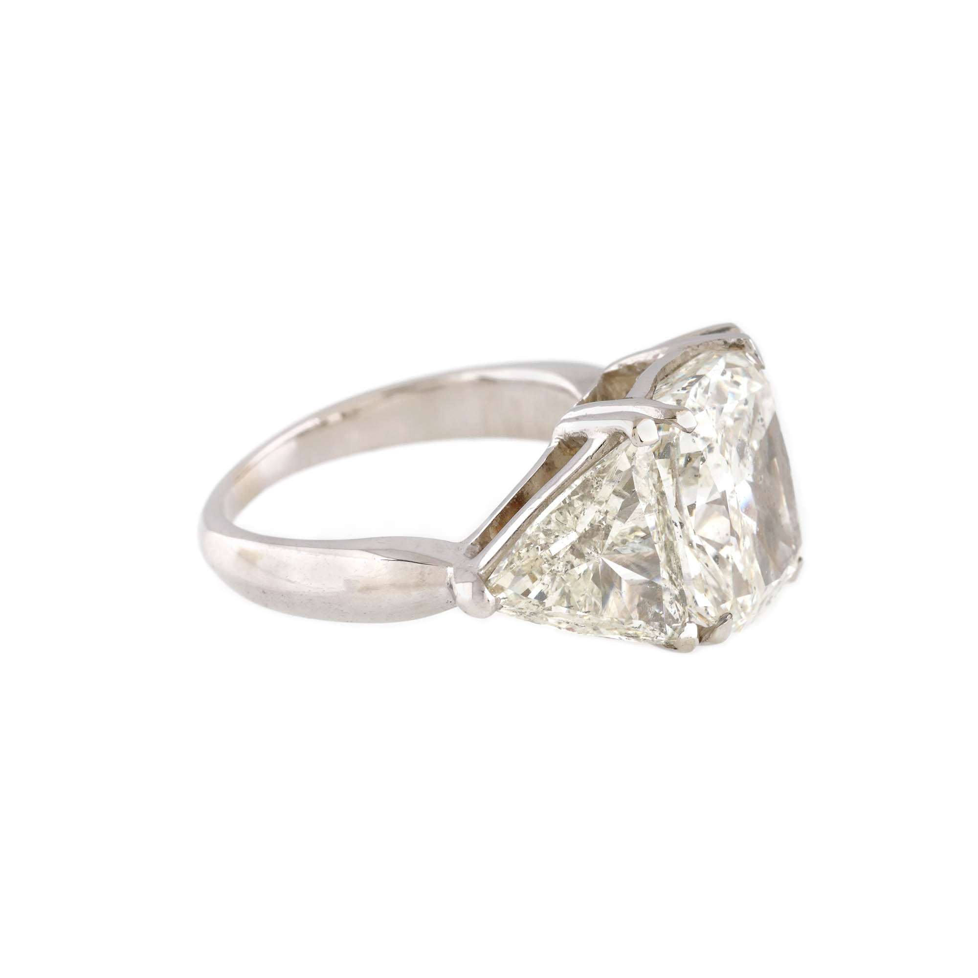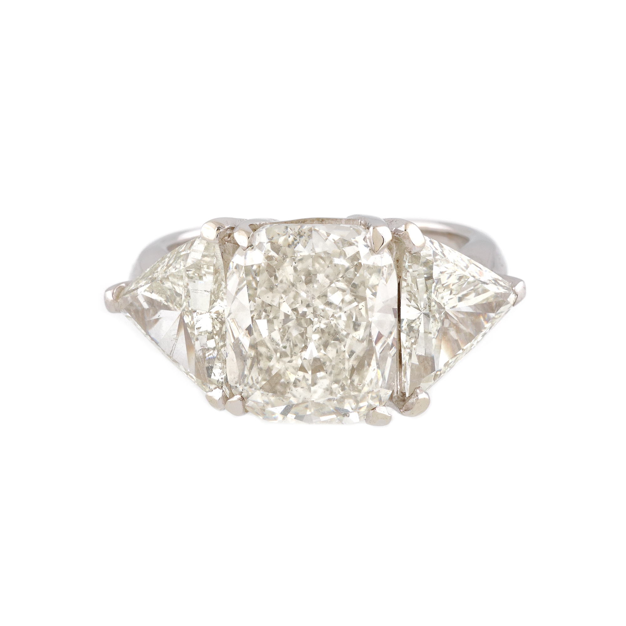 1 diamant cushion rectangular , culoare H, claritate SI2, cca. 5,03 ct. și 2 diamante triunghiulare, culoare H, claritate VS1-SI2, cca. 3 ct.
