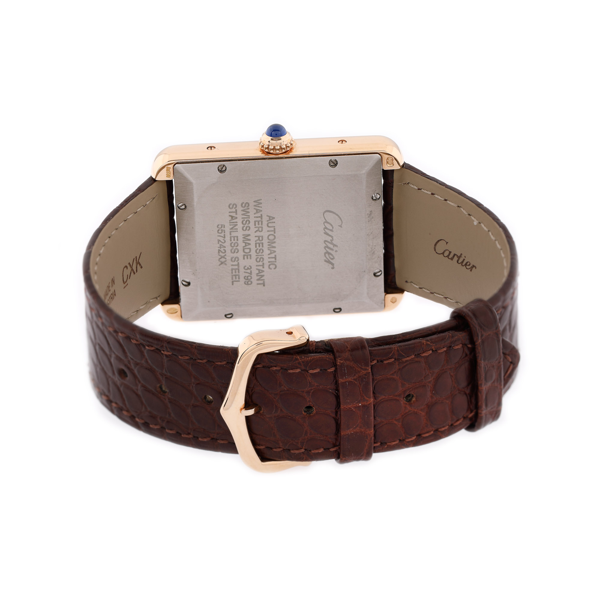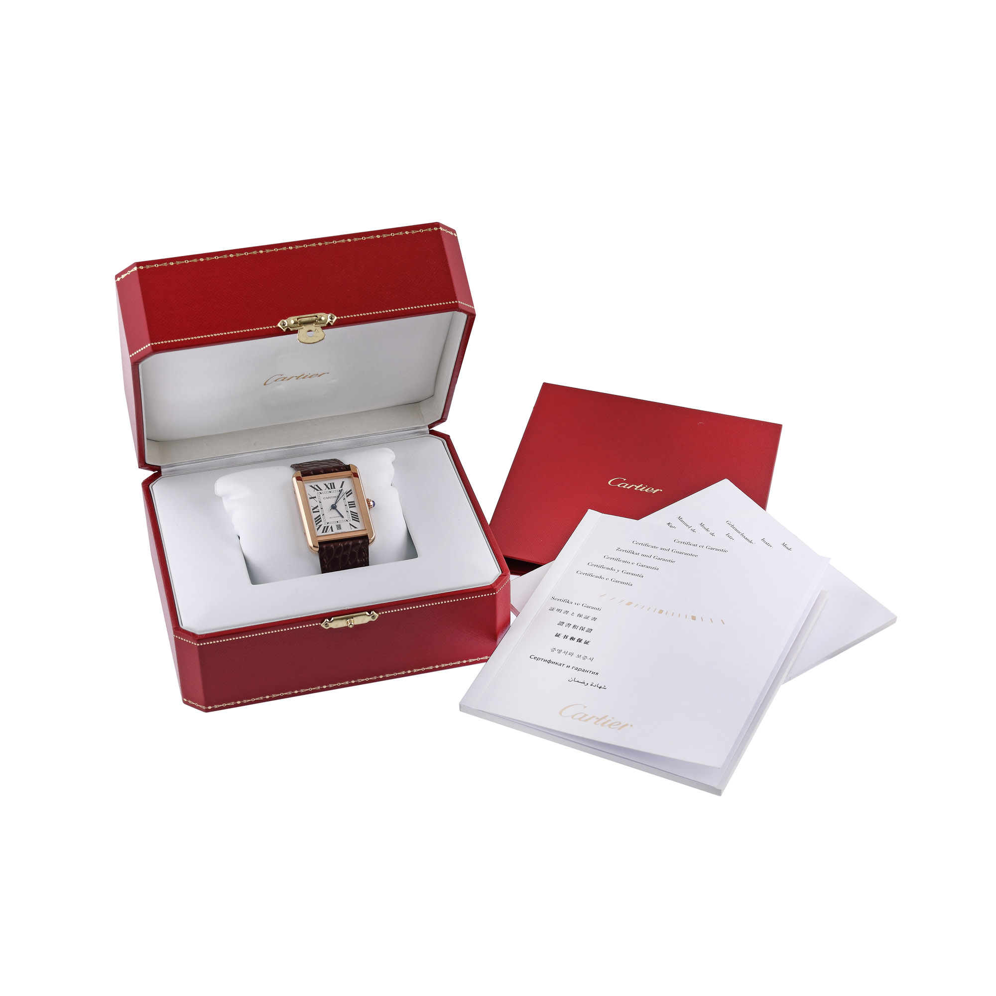 Ceas Cartier Tank Solo, din aur roz, de mână, bărbătesc, referință W5200026, mecanism automatic. Cadran de culoare alb, cu cifre romane și registru pentru dată în dreptul orei 6. Curea din piele de aligator, de culoare maro și cataramă, originale. Accesorii: cutia originală, manual de utilizare și certificat de garanție datat (15.03.2019), semnat și ștampilat de către retailer (Bucherer Deutschland).