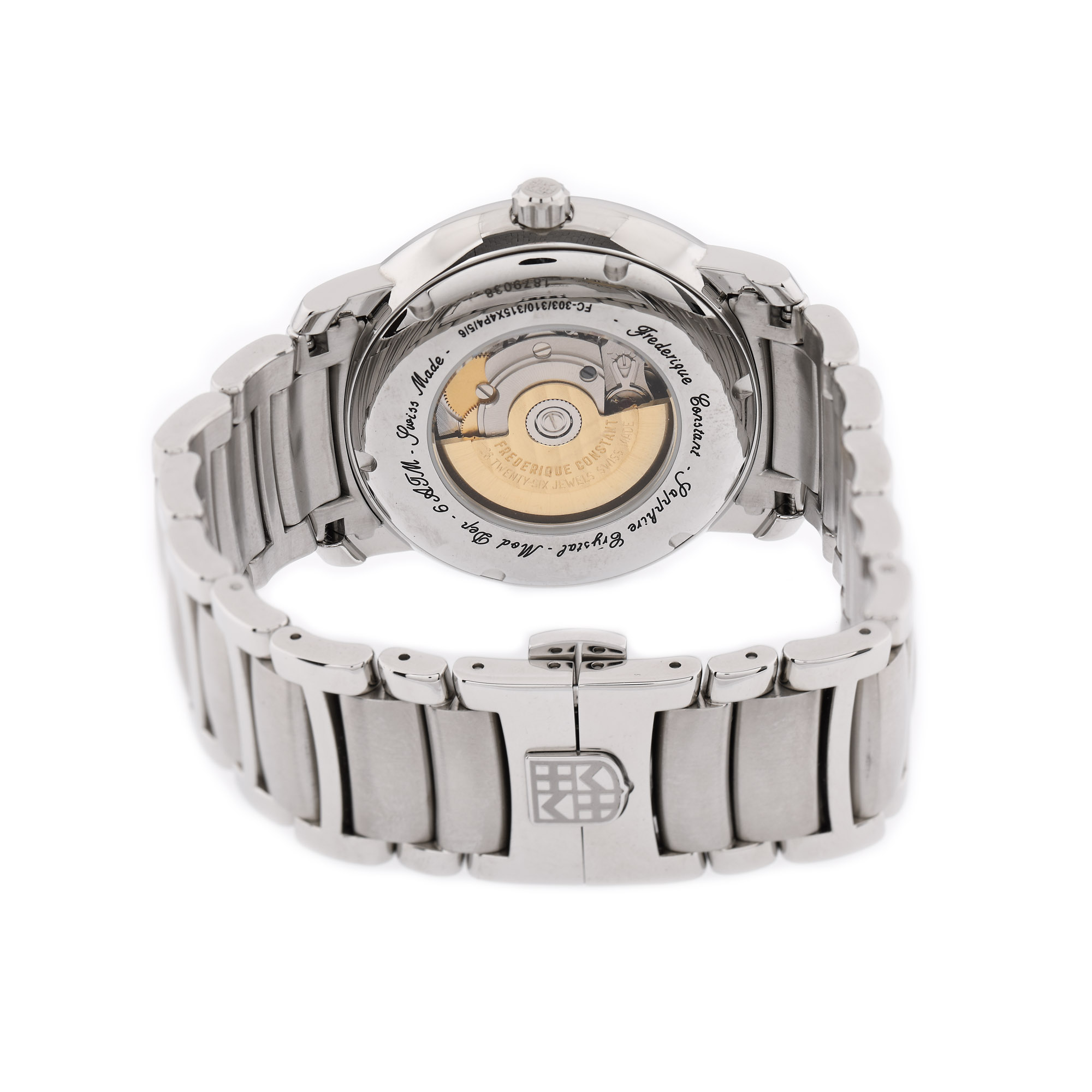 Ceas Frédérique Constant Classics, de mână, bărbătesc, referință FC-303M4P6B3, mecanism automatic, calibru FC-303. Cadran de culoare argintiu, decorat în tehnica guilloché, cu numerale romane și registru pentru dată în locul orei 6. Brățară și închidere tip deployant, originale. Accesorii: cutia originală, manual de utilizare