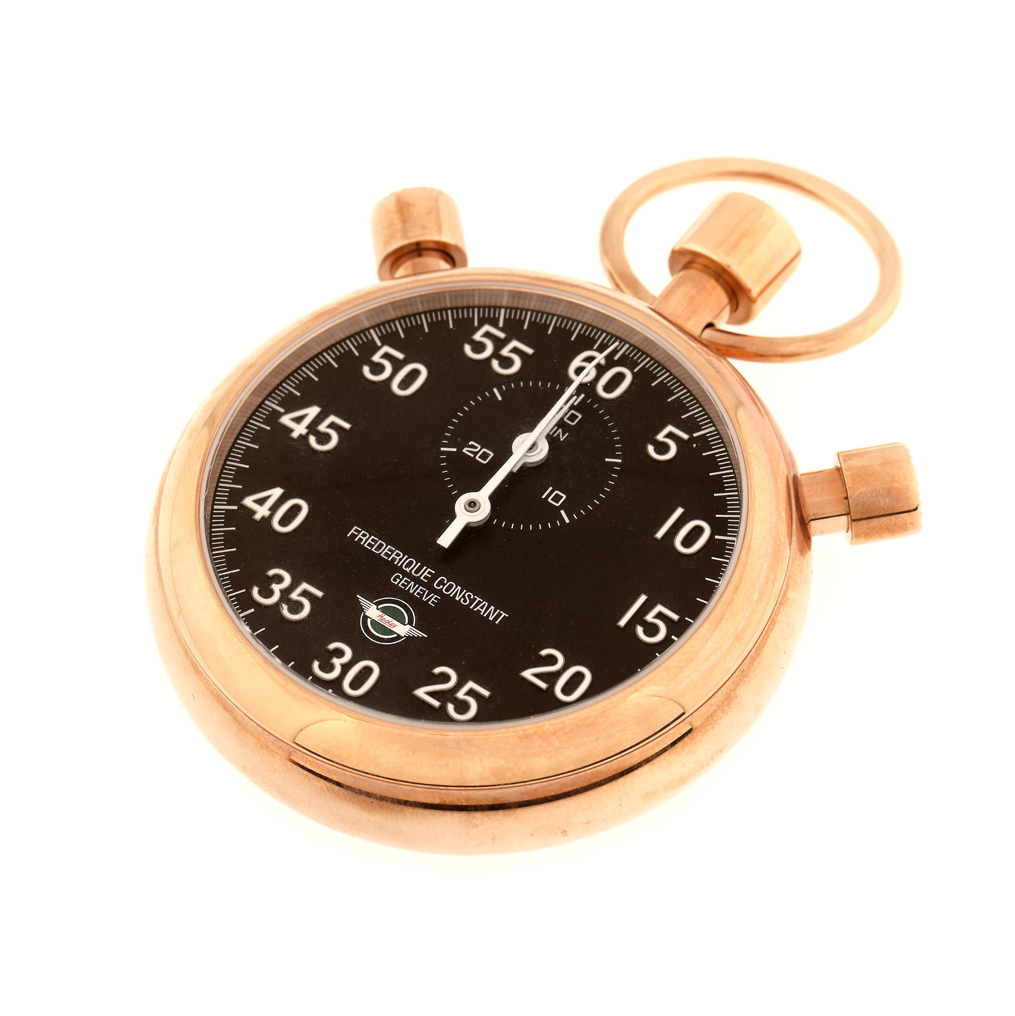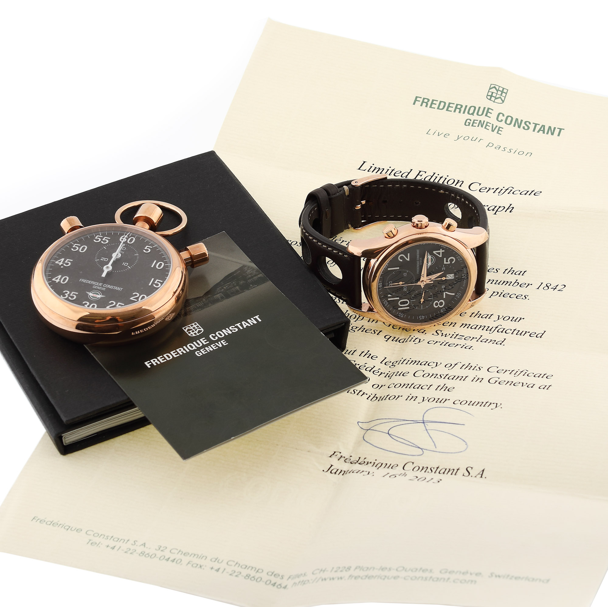 Ceas Frédérique Constant Healey Challenge, de mână, bărbătesc, ediție limitată 1842/1888, mecanism automatic. Cadran de culoare negru, numerale arabe, trei registre și dată în dreptul orei 6. Curea din piele de culoare maro și cataramă din oțel aurit cu aur roz, originale. Accesorii: cronometru; certificat de garanție semnat și datat 16/01/2013; cutie originală
