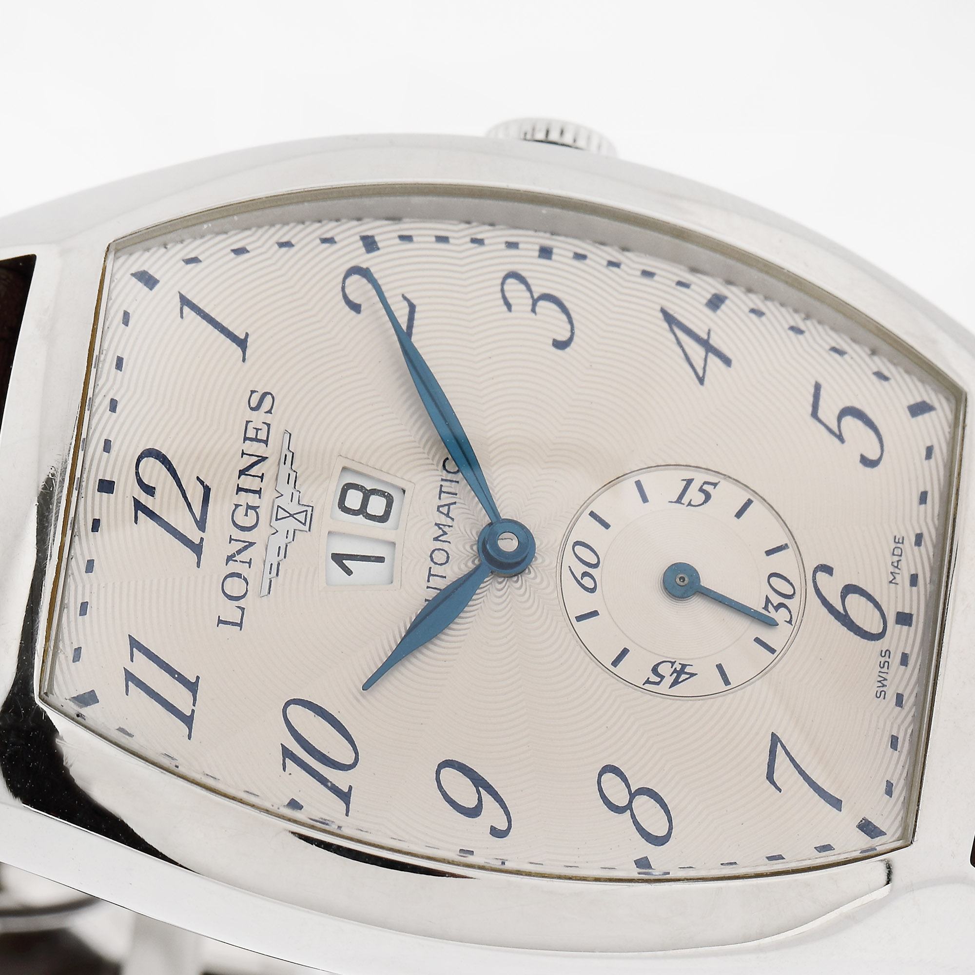 Ceas Longines Evidenza, de mână, bărbătesc, referință L2.670.4, mecanism automatic. Cadran crem, decorat în tehnica guilloché, numerale arabe, registru pentru secundar în dreptul orei 6 și registru pentru dată în dreptul orei 12. Curea din piele, de culoare maro și sistem de închidere tip deployant, adăugate aftermarket.
