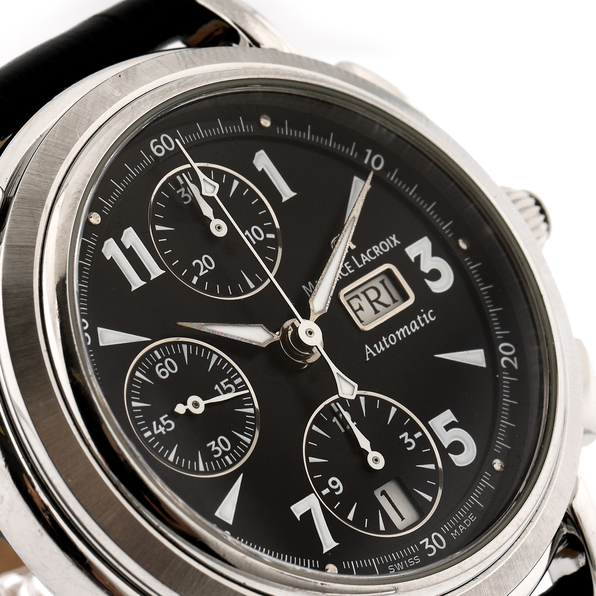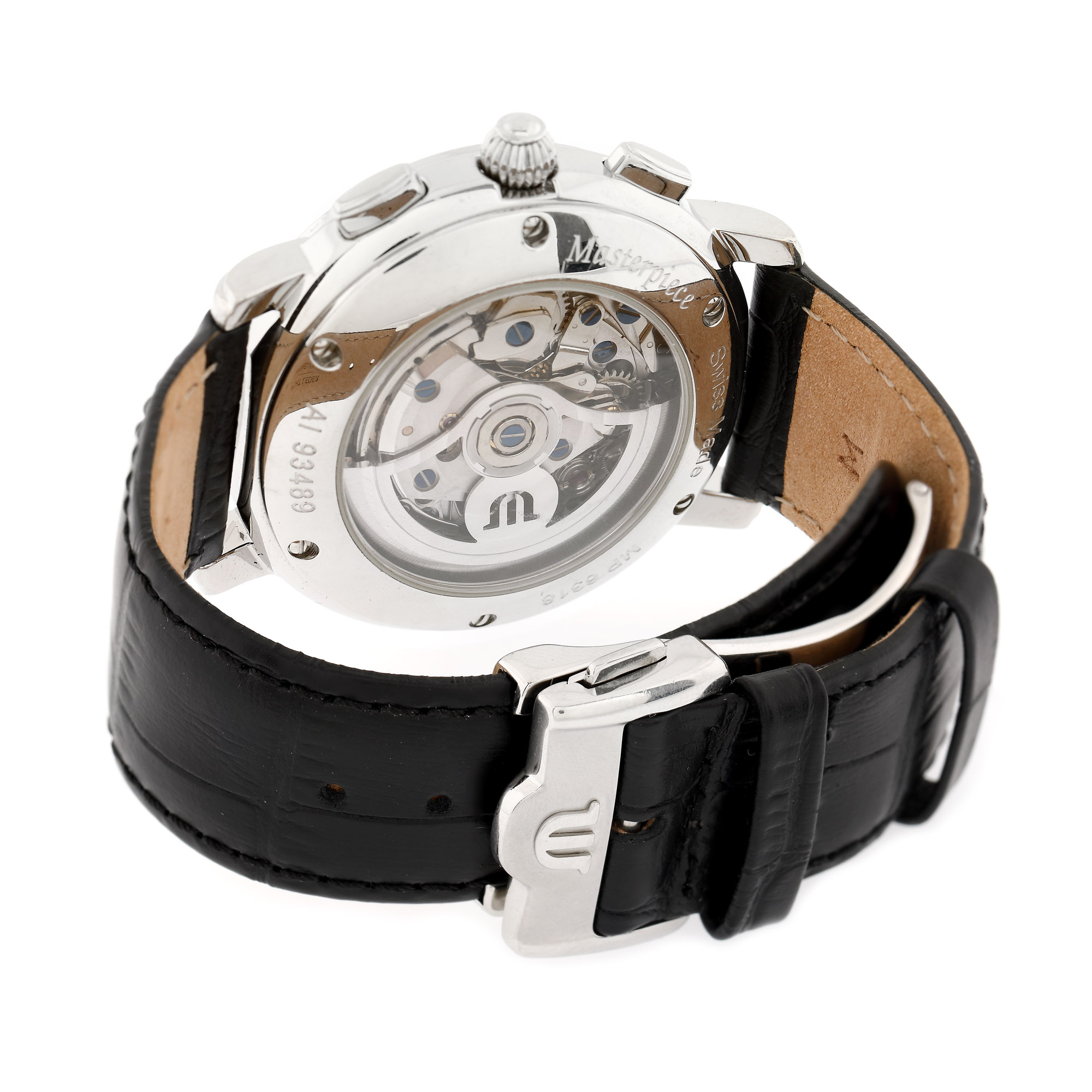 Ceas Maurice Lacroix Masterpiece, de mână, bărbătesc, referință MP6318, mecanism automatic. Cadran de culoare negru, numerale arabe, trei registre, dată în dreptul orei 6 și registru pentru ziua săptămânii, în dreptul orei 3. Curea din piele, de culoare neagră, adăugată aftermarket și sistem de închidere tip deployant, original.