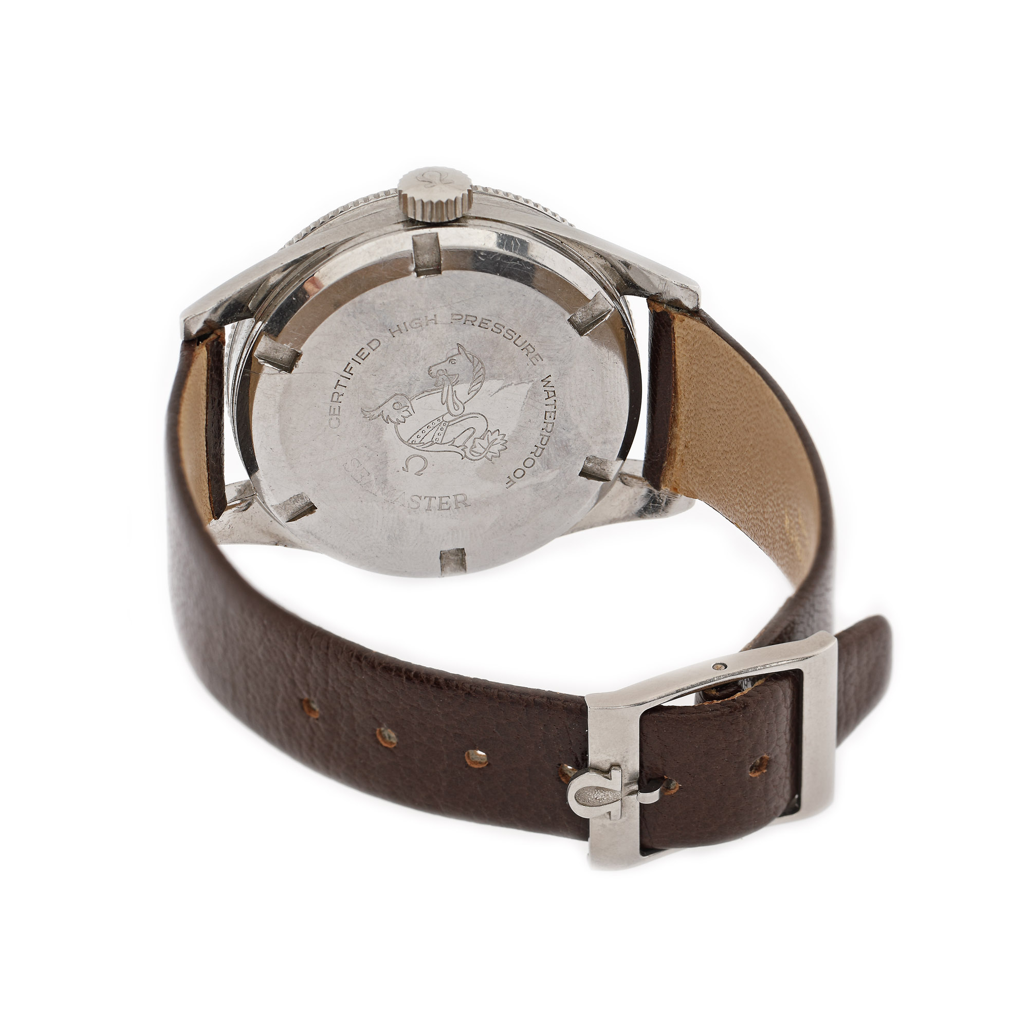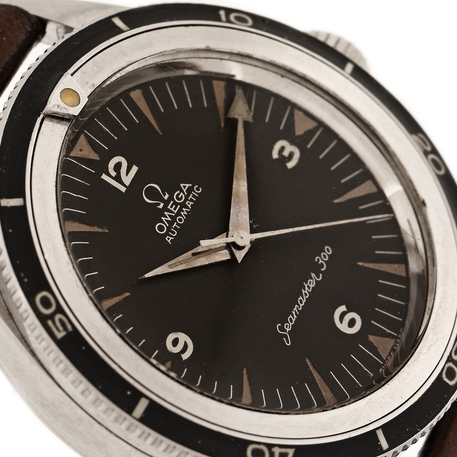 Ceas Omega Seamaster 300, de mână, bărbătesc, referință CK 14.755, mecanism automatic. Cadran de culoare negru, cu numerale arabe. Bezel rotativ. Curea din piele de vițel, de culoare maro cu cataramă, originale. Accesorii: însoțit de extrasul de arhivă Omega November 24th 2021