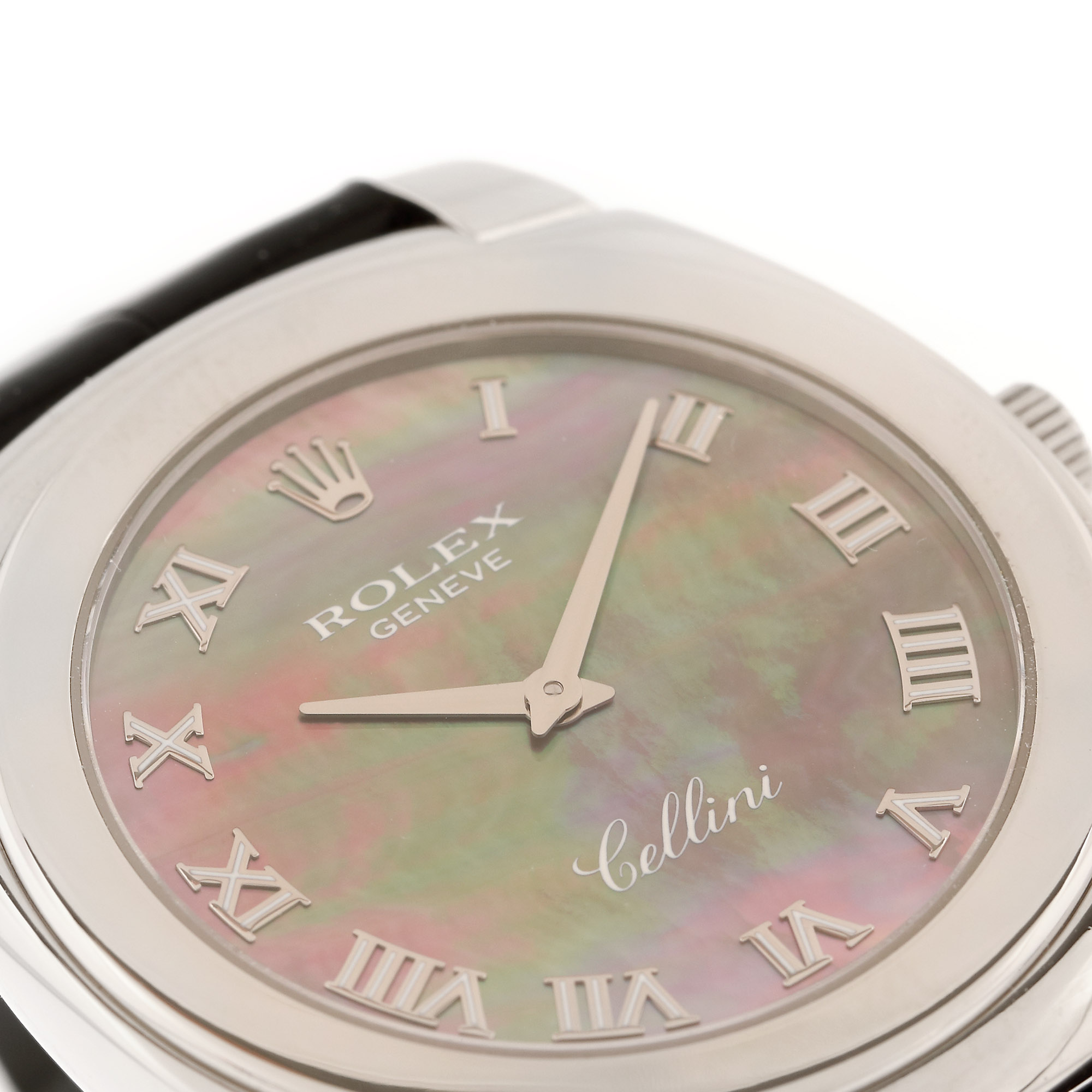 Ceas Rolex Cellini, din aur alb, de mână, unisex, referință 5330, mecanism cu armare manuală. Cadran din sidef, cu numerale romane. Curea din piele, de culoare neagră, adăugată aftermarket și cataramă din aur alb, originală.