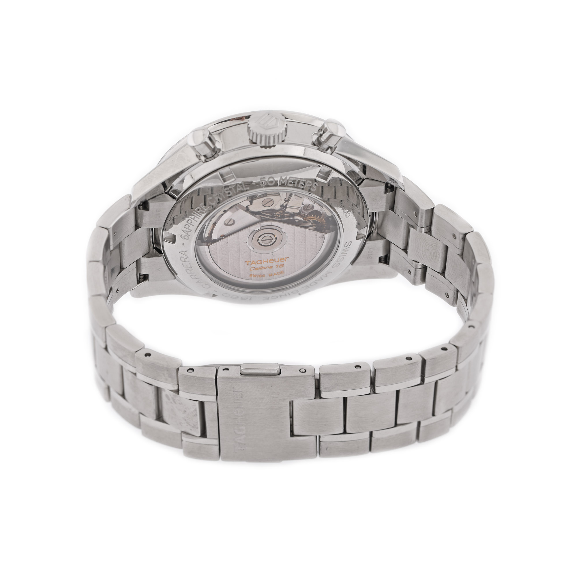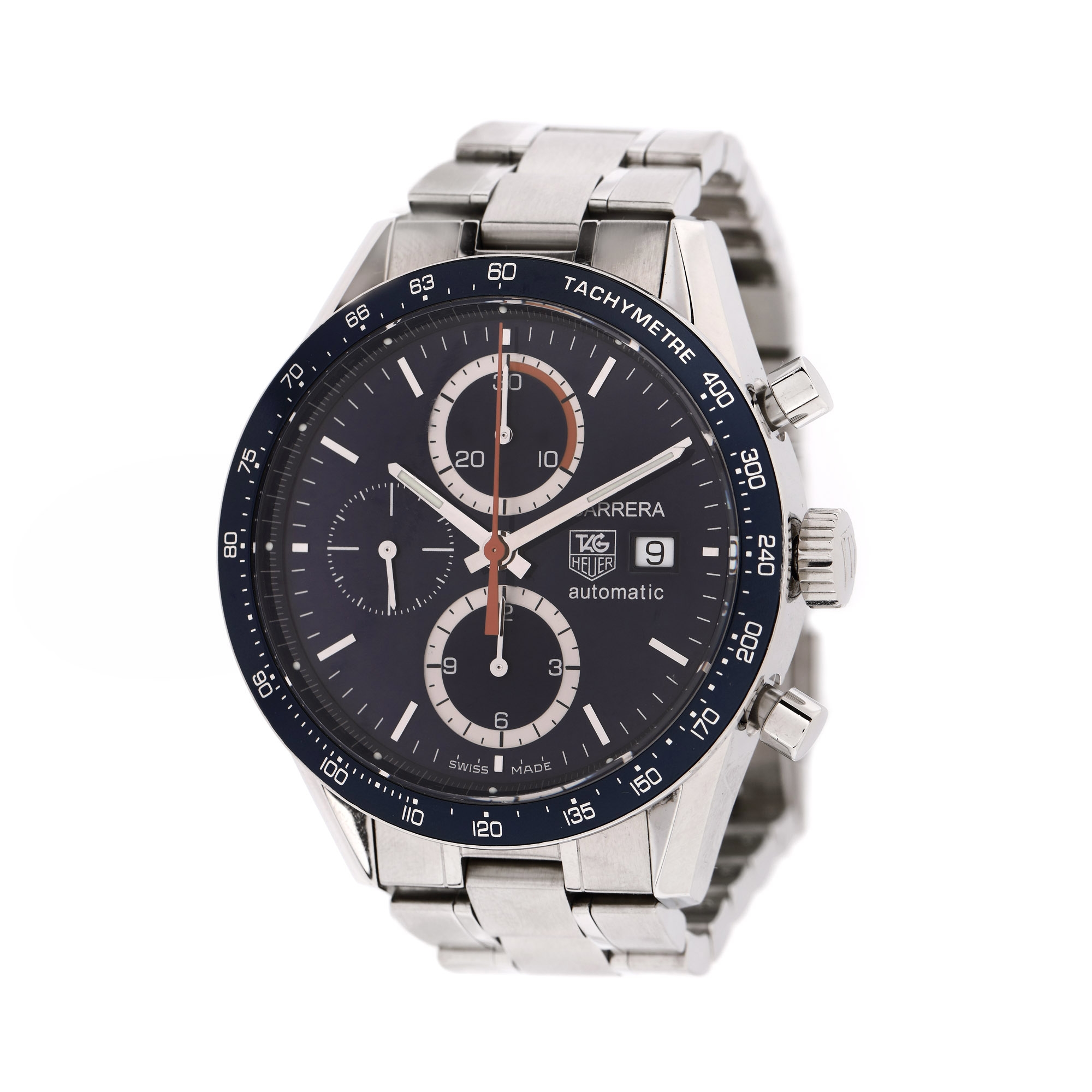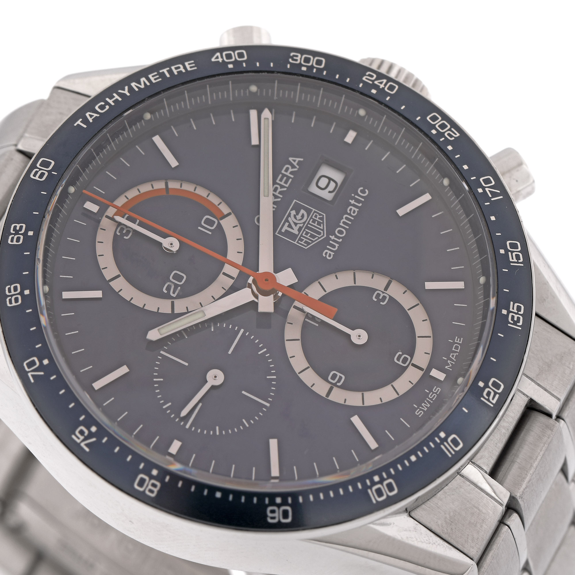 Ceas Tag Heuer Carrera, de mână, bărbătesc, referință CV2015, mecanism automatic. Cadran de culoare bleumarin, cu indici orari din oțel, cronograf tri-compax, registru pentru dată, în dreptul orei 3 și scală tahimetrică. Brățară din oțel inoxidabil și sistem de închidere tip deployant, originale.