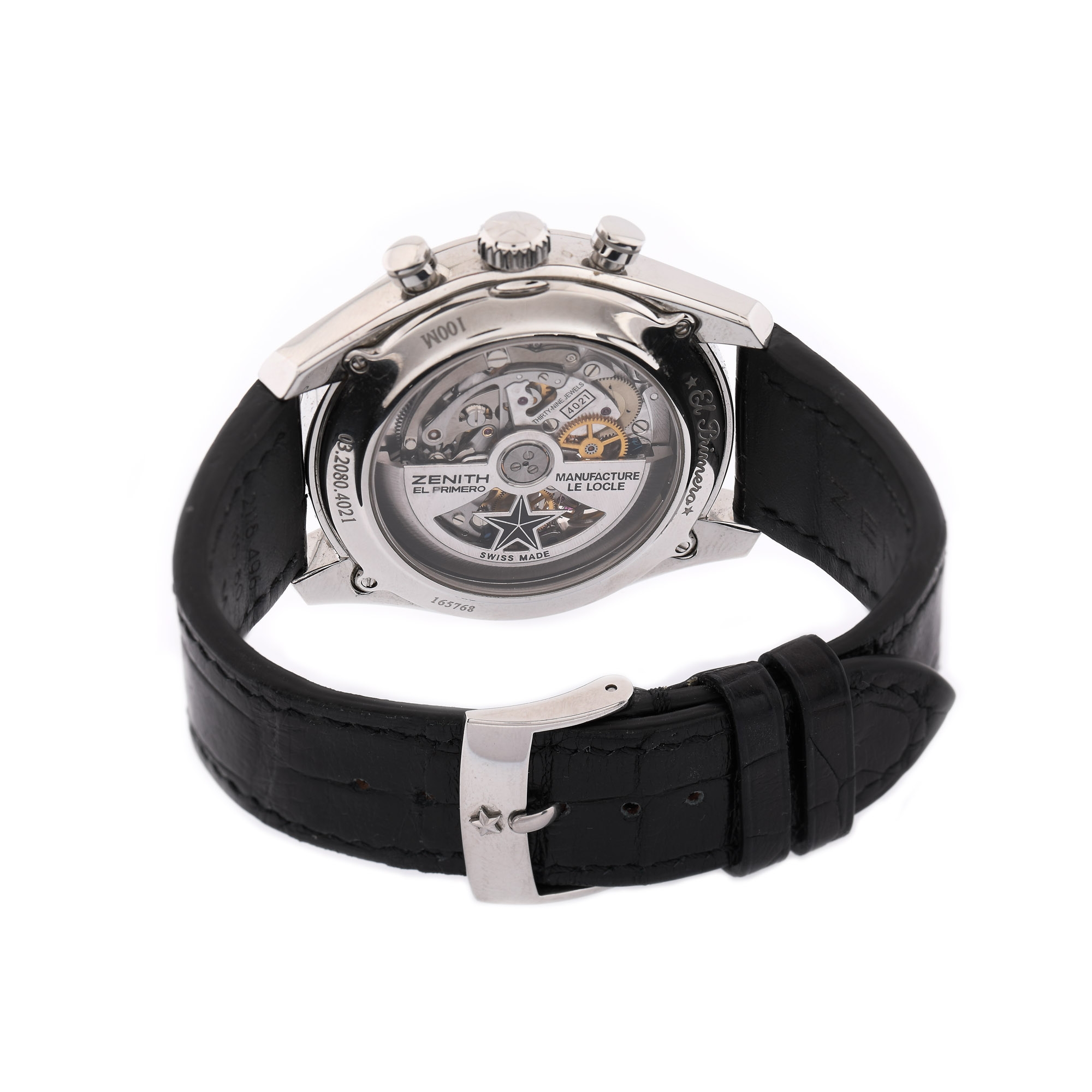 Ceas Zenith Chronomaster El Primero Open, de mână, bărbătesc, referință 03.2080.4021, mecanism automatic, anterior vitrat, calibru 4021. Cadran de culoare negru, scară tahimetrică, registru pentru rezervă de timp și parțial vitrat între orele 9 și 11. Curea din piele de crocodil, de culoare neagră și cataramă din oțel inoxidabil, originale.