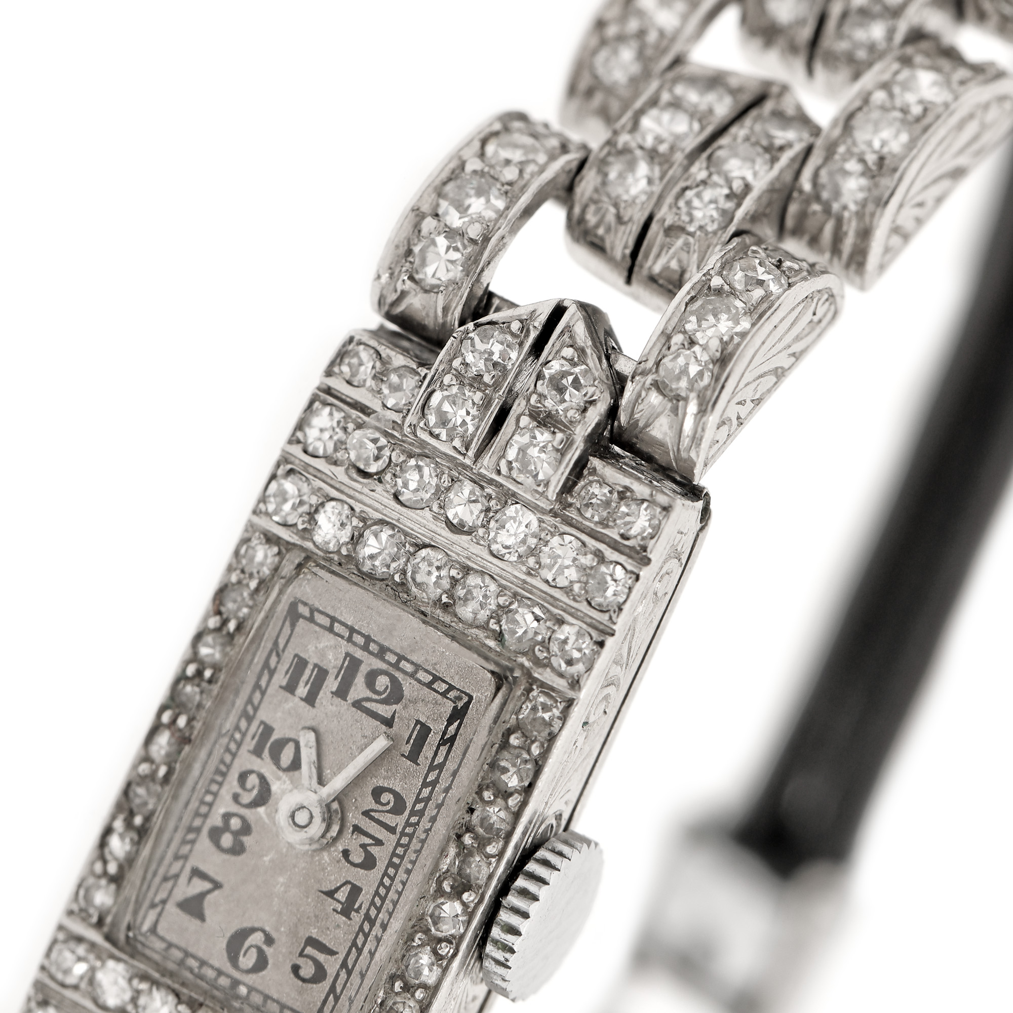 31. Ceas Art Deco, din platină, decorat cu diamante, de mână, de damă