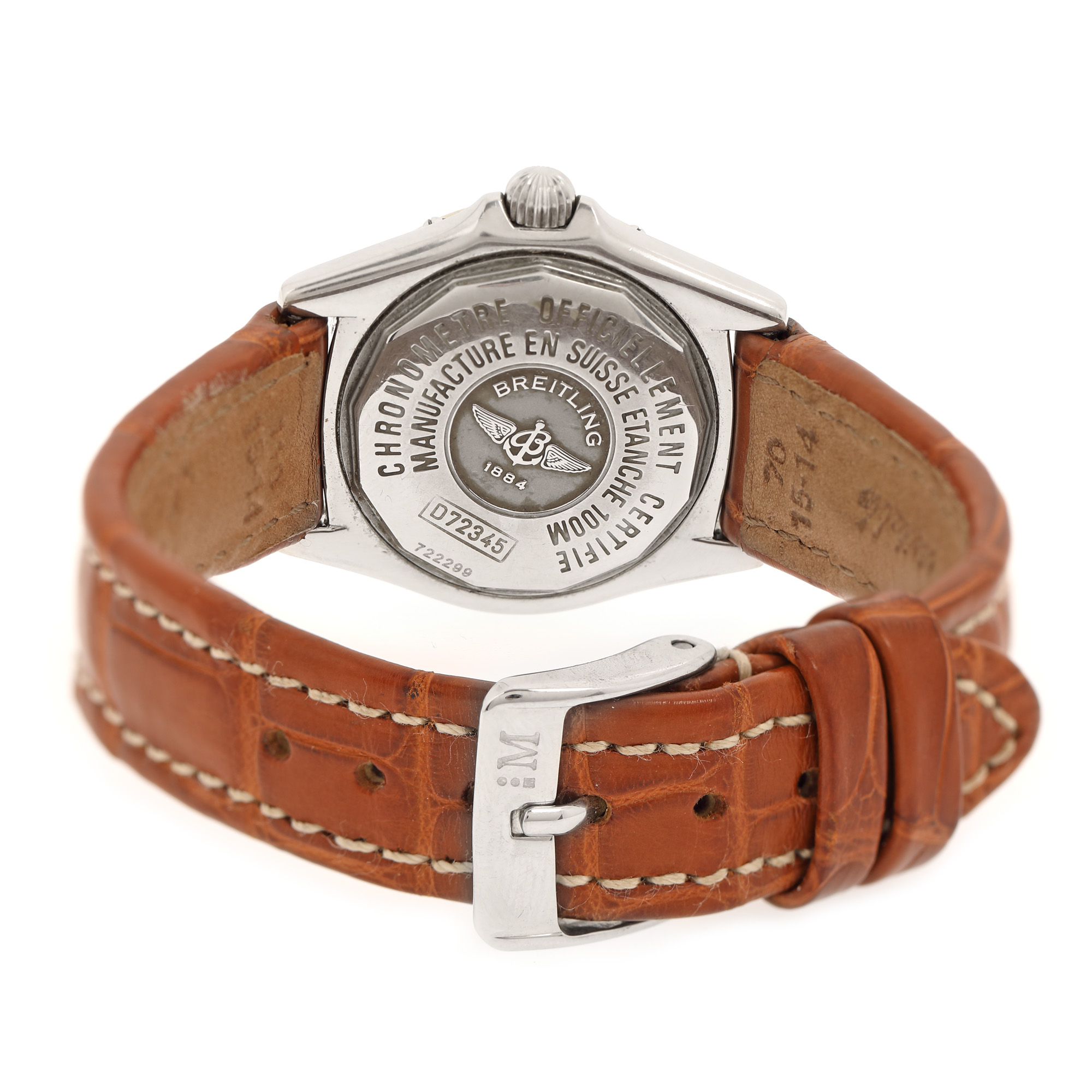 Ceas Breitling Callistino, de mână, de damă, referință D72345. Mecanism quartz, bezel rotativ, unidirecțional. Cadran din sidef cu indici rectangulari, cu registru pentru dată în dreptul orei 3. Curea originală, din piele de crocodil, de culoare maro cu sistem de închidere clasic, cu cataramă aftermarket.