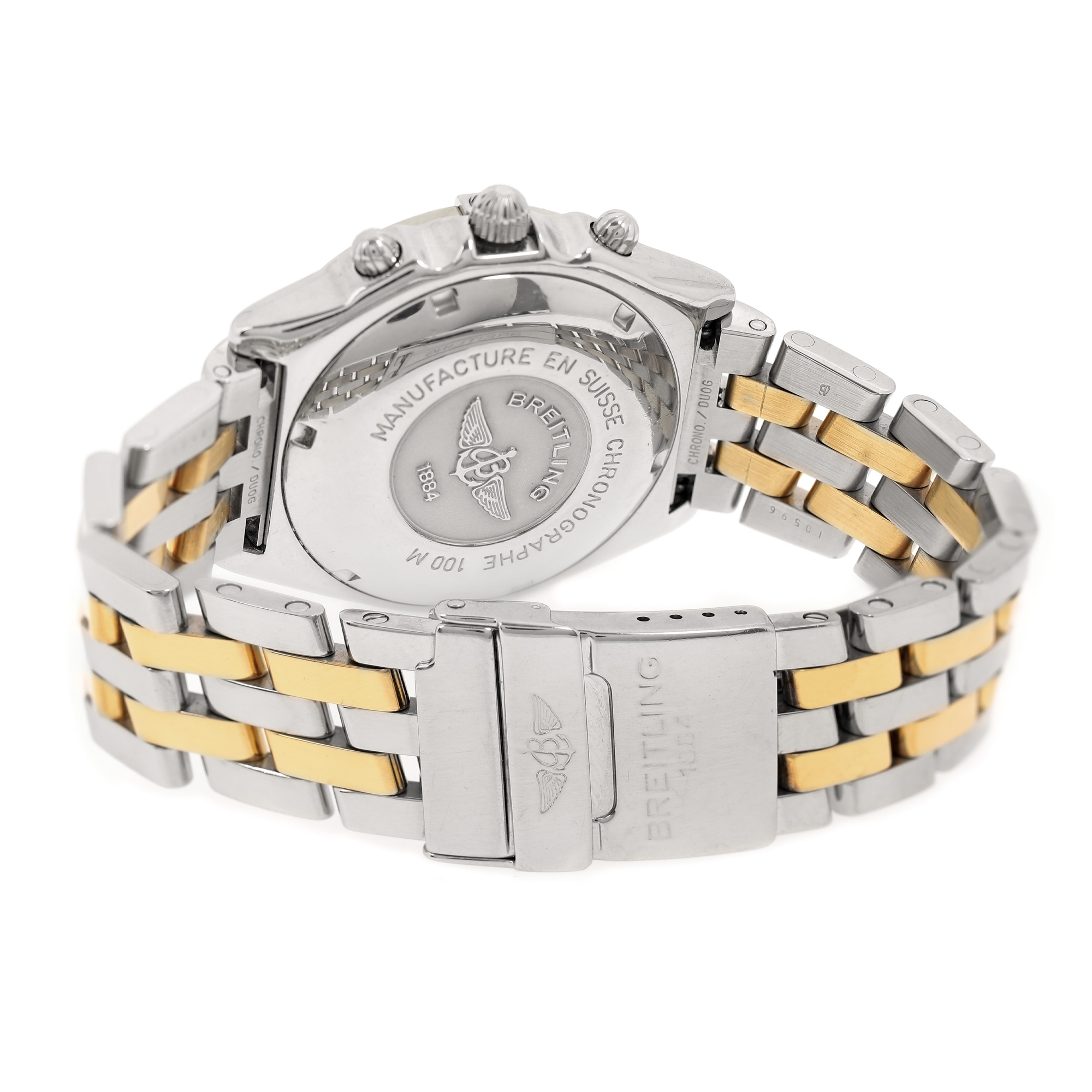 Ceas Breitling Chronomat, de mână, bărbătesc, referință D13050. Mecanism automatic, calibrul Breitling 13, calibrul de bază ETA Valjoux 7750, cu 25 de rubine, cu funcție de chronograph, bezel rotativ, unidirecțional. Cadran de culoare gri, cu indici baghete, cu două registre pentru chronograph în dreptul orelor 6 și 12, registru pentru secundar în dreptul orei 9, registru pentru dată în dreptul orei 3. Brățară originală, din oțel, cu sistem de închidere de tip deployant.